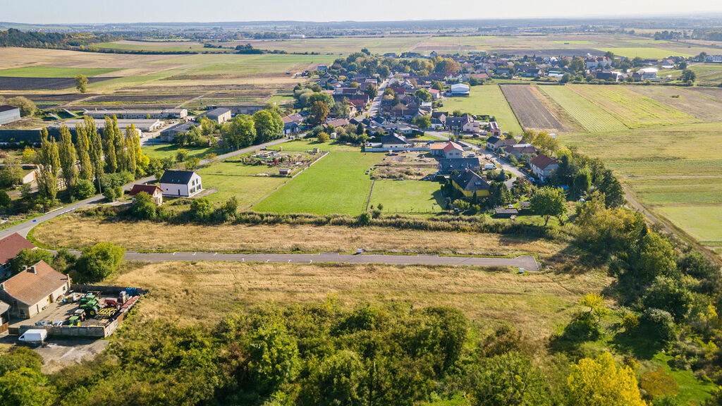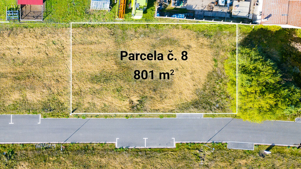 Stavební pozemek 801 m² pro stavbu RD včetně připraveného napojení (přípojek) a nové příjezdové asfaltové komunikace s veřejným osvětlením; připravený vjezd až na parcelu.