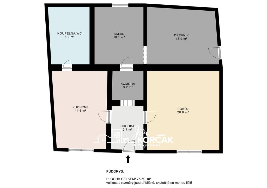 Vlevo od chodby se nachází kuchyně a koupelna s WC, vpravo obytný pokoj.