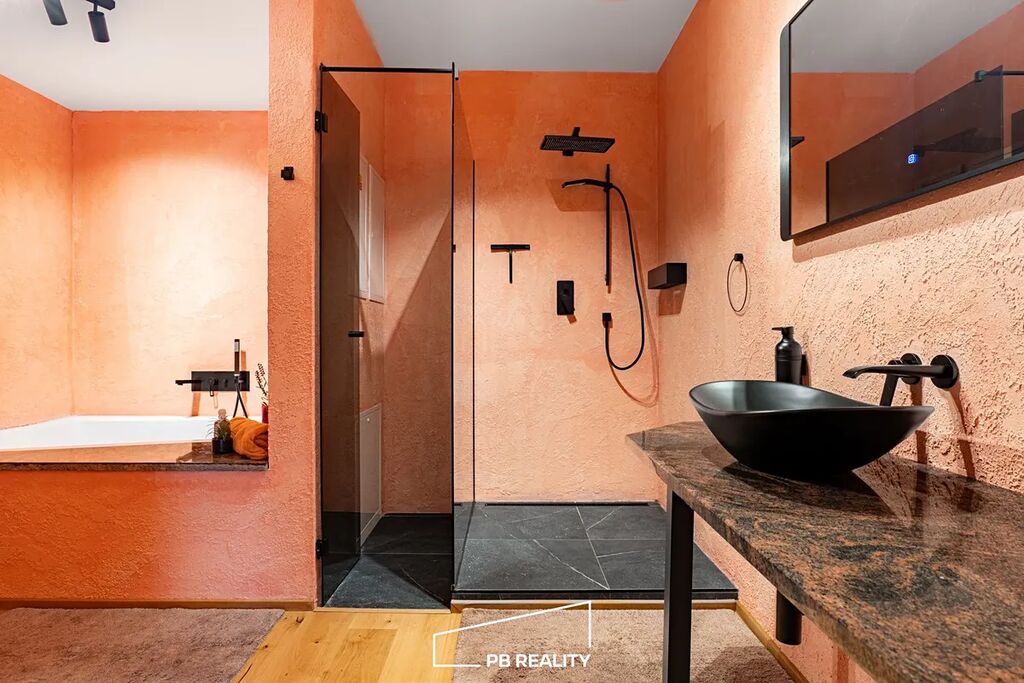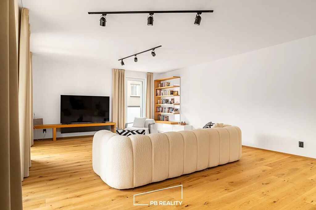 Dřevěná podlaha, podsvícená kuchyňská linka včetně spotřebičů v minimální hodnotě 300 000,-Kč s italskou stěrkou Travertino Romano, prostorná koupelna též kompletně v italské stěrce Travertino Romano s vanou a walk – in sprchou, na zakázku šité black-out závěsy v celém bytě, podsvícená skleněná příčka a zakázková skříňová sestava.