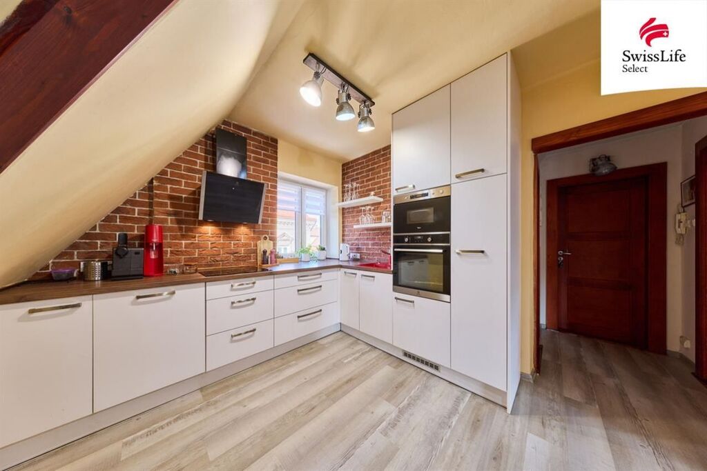 Dispozice: vstupní chodba, kuchyně s novou kuchyňskou linkou, technická místnost, koupelna s vanou a WC, prostorná ložnice a obývací pokoj. Z obývacího pokoje vede schodiště do mezonetového patra, kde se nachází další samostatný pokoj. K bytu náleží také sklep.