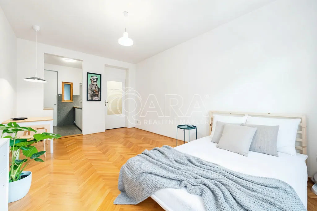 Dispozice bytu je promyšlená a funkční: vstupní chodba, vzdušný obytný prostor s manželskou postelí, moderní kuchyňský kout, praktická komora a elegantní koupelna se sprchovým koutem a toaletou. K bytu náleží také čerstvě zrekonstruovaný sklep. Součástí pronájmu je i možnost využívat sdílený balkón.