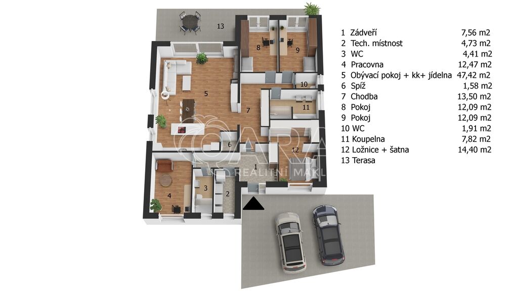 V ceně pozemku je i projekt se stavebním povolením pro vybudování přízemního rodinného domu, takže můžete začít ihned stavět. Jde o příjemně navržený cihlový bungalov s energetickou náročností typu A s dispozicí 5+kk s terasou a parkovacím stáním pro dva vozy o celkové zastavěné a zpevněné ploše 268 m2. Pro okamžité čerpání elektřiny na případnou výstavbu je dodělána dodatečná přípojka. V roce 2025 je plán napojení domu na již vybudovanou obecní kanalizaci, takže navržená jímka se využije jako retenční nádrž na dešťovou vodu.