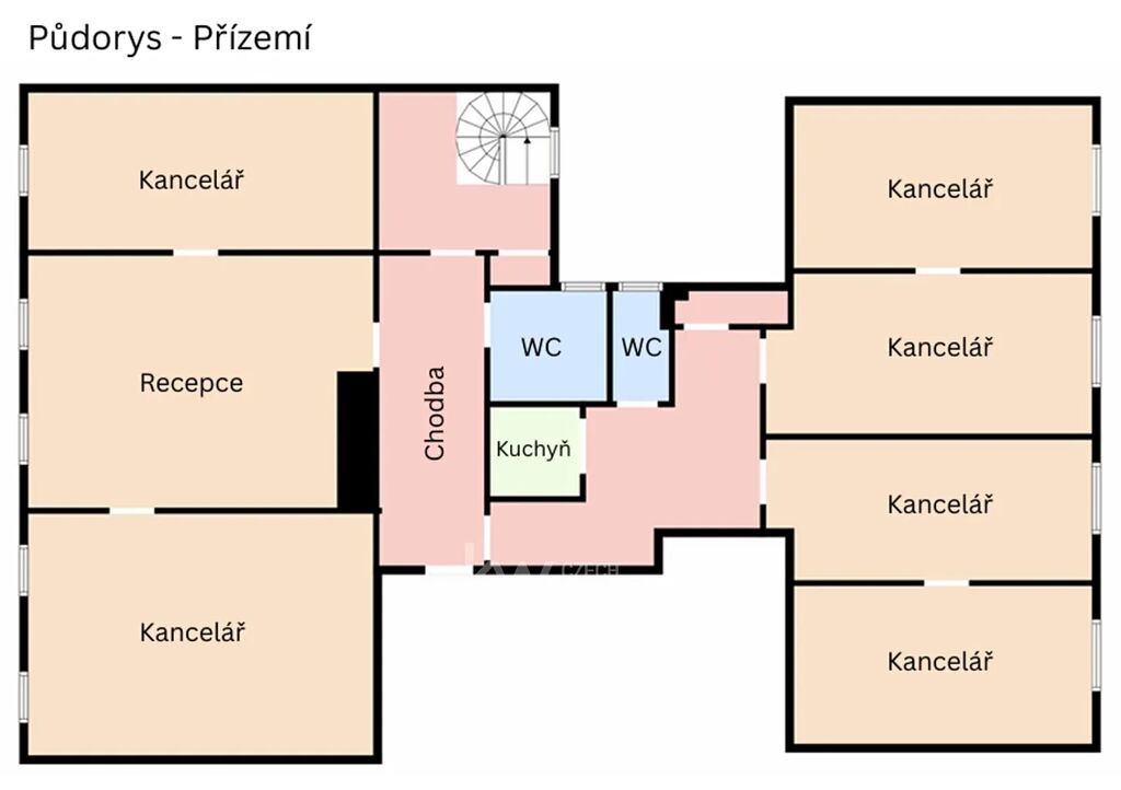 Prostory o celkové výměře 270 m² se nacházejí v přízemí a 1. patře činžovního domu a jsou vzájemně propojeny točitým schodištěm (nelze je užívat samostatně).