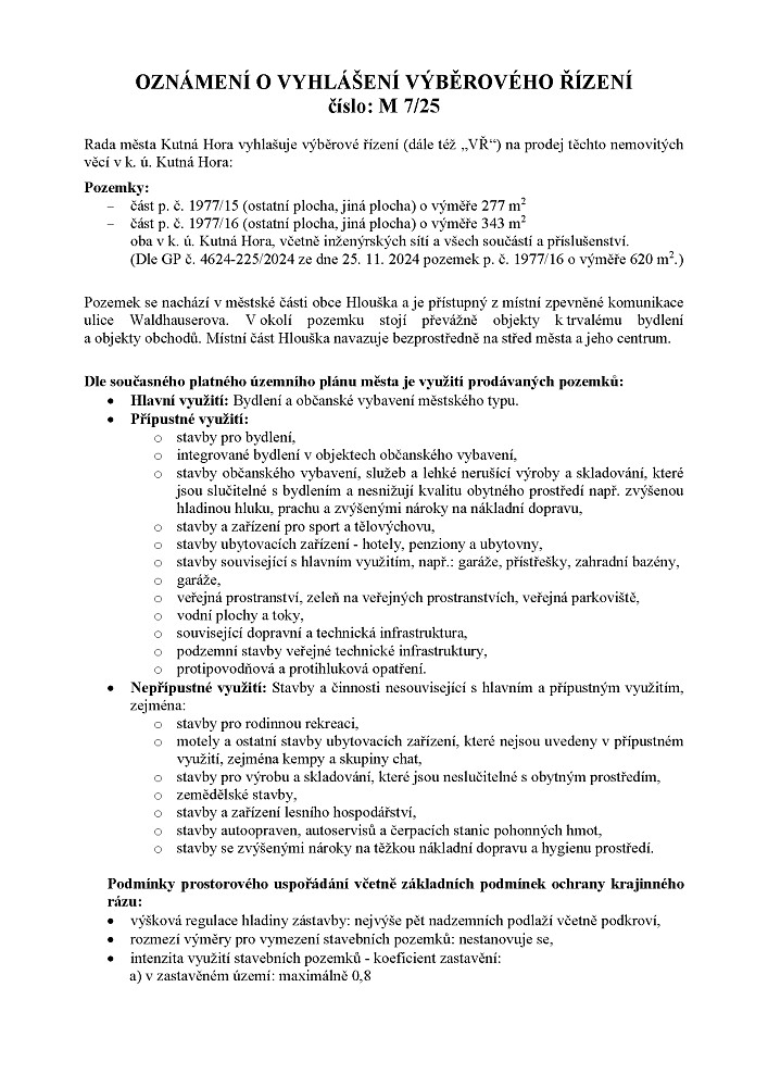 Pozemek je prodáván formou výběrového řízení. Konkrétní podmínky prodeje jsou popsány v přiloženém Oznámení o vyhlášení výběrového řízení č. M 7/25.