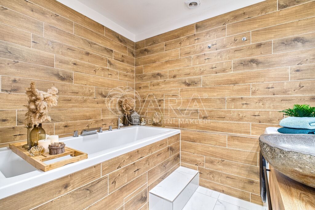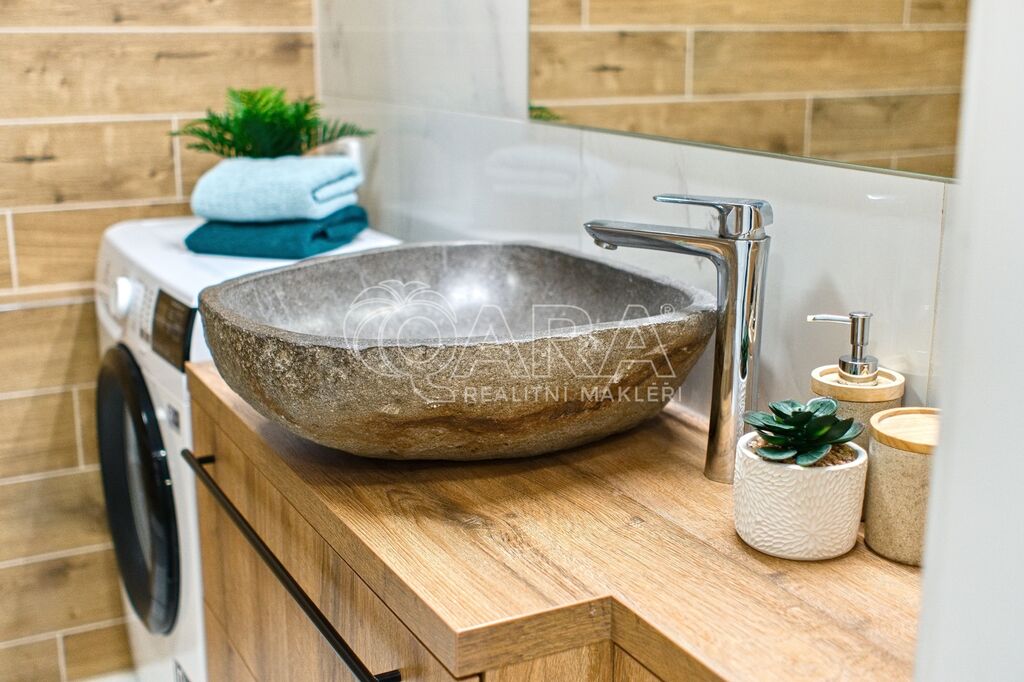 Najdete zde zděné jádro, prostornou koupelnu s vanou a umyvadlem z říčního kamene, kam se pohodlně vejde pračka i sušička.