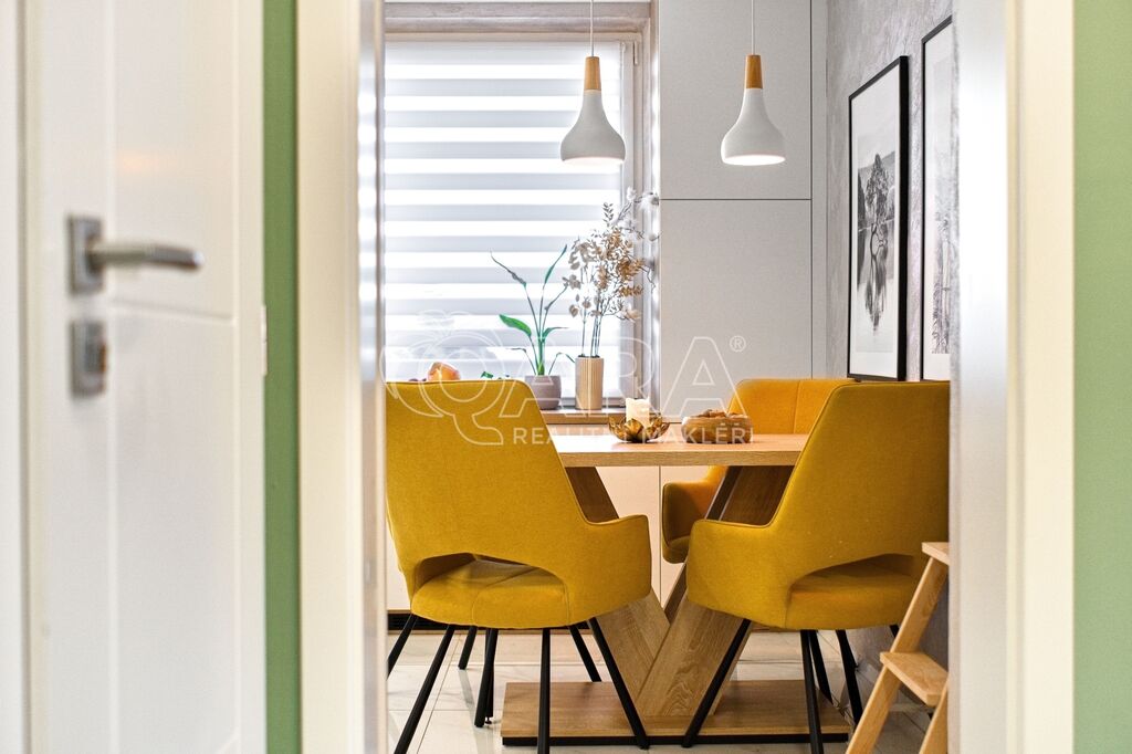 Kuchyň nabízí velké množství úložných prostorů, včetně chytře řešené části za jídelním stolem, a navíc z ní vstoupíte na zasklený balkon, ideální pro ranní kávu i zimní odpočinek.