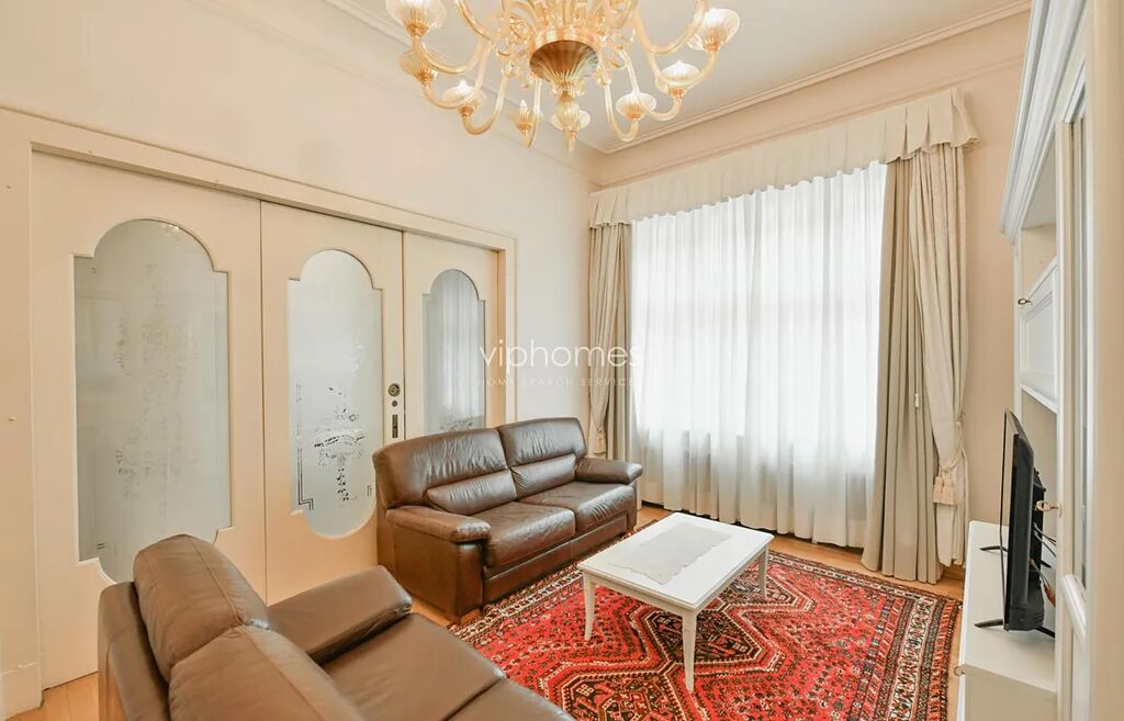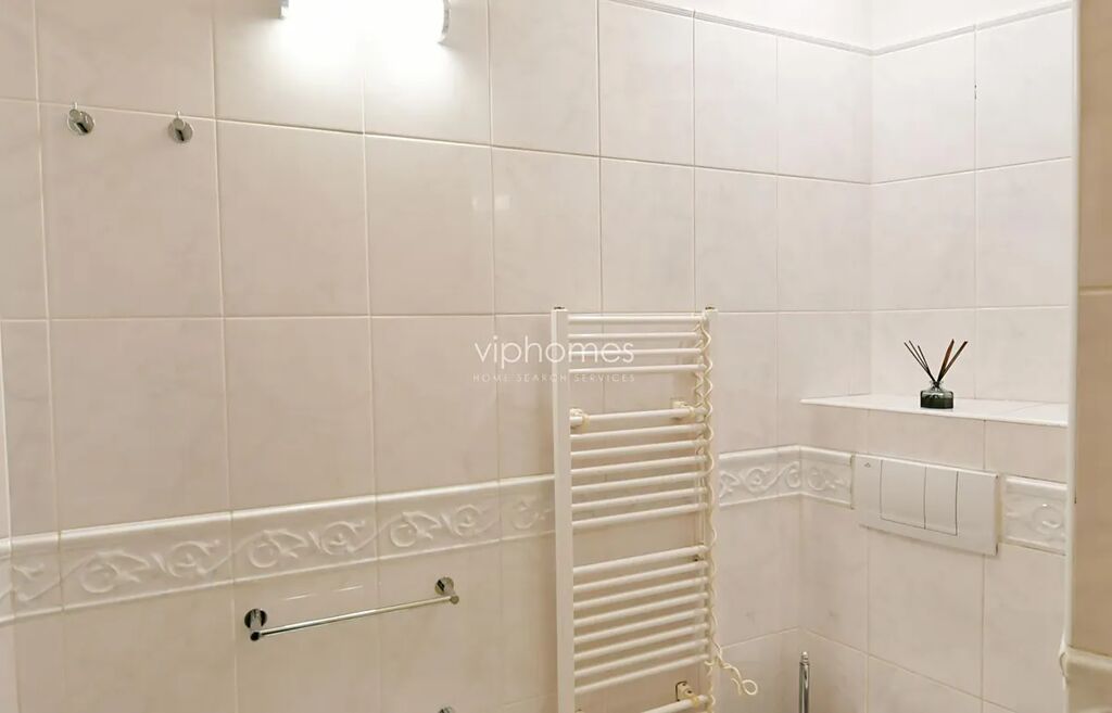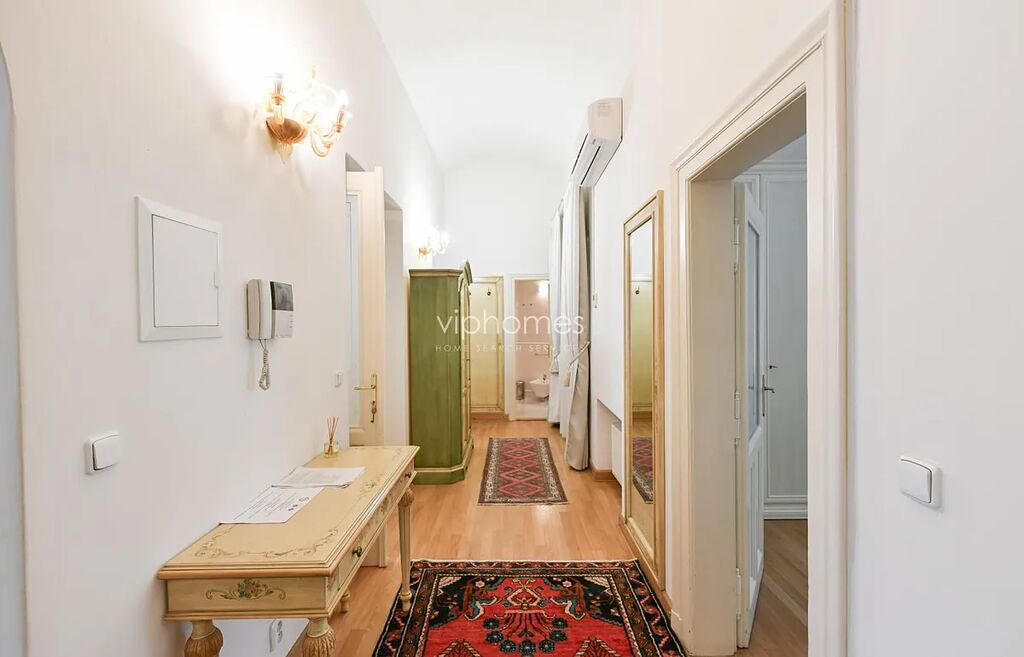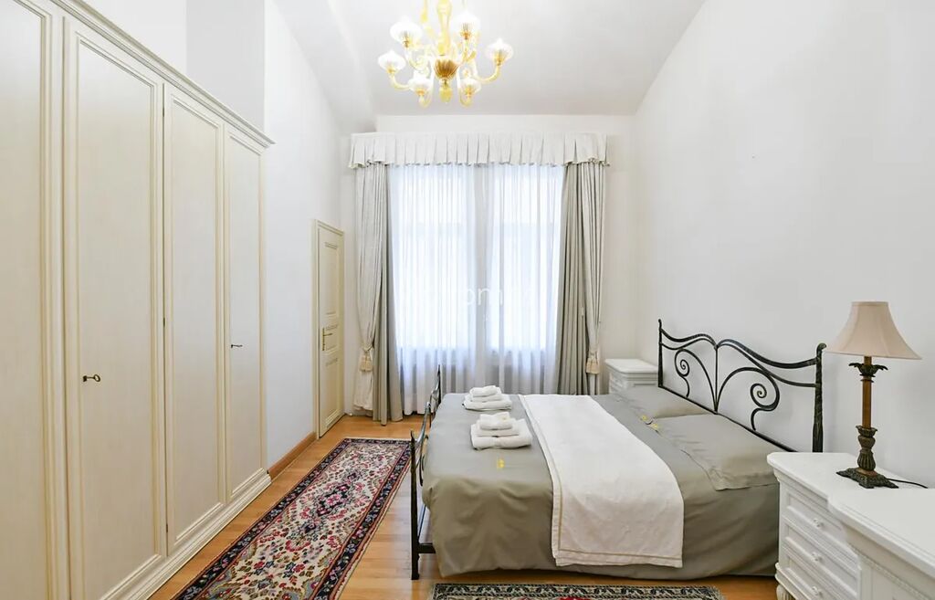 Dispozice: obývací pokoj s jídelním prostorem a plně vybavenou kuchyní, 2 ložnice, 2 koupelny, hlavní ložnice s vanou, toaletou a bidetem, druhá ložnice ze sprchovým koutem, bidetem, a toaletou, technická místnost. Byt je kompletně vybavený nábytkem a spotřebiči, (nechybí sporák, digestoř, myčka, horkovzdušná a mikrovlnná trouba, lednice s mrazákem, pračka, televize). Stylový interiér bytu rezonuje s historickými prvky budovy.