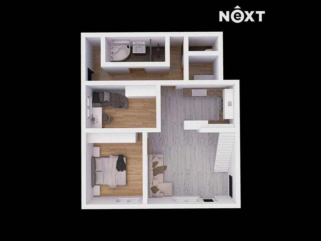 Celková podlahová plocha dvojdomku je 108 m², ale společně s využitelným horním prostorem to může být o dost více.