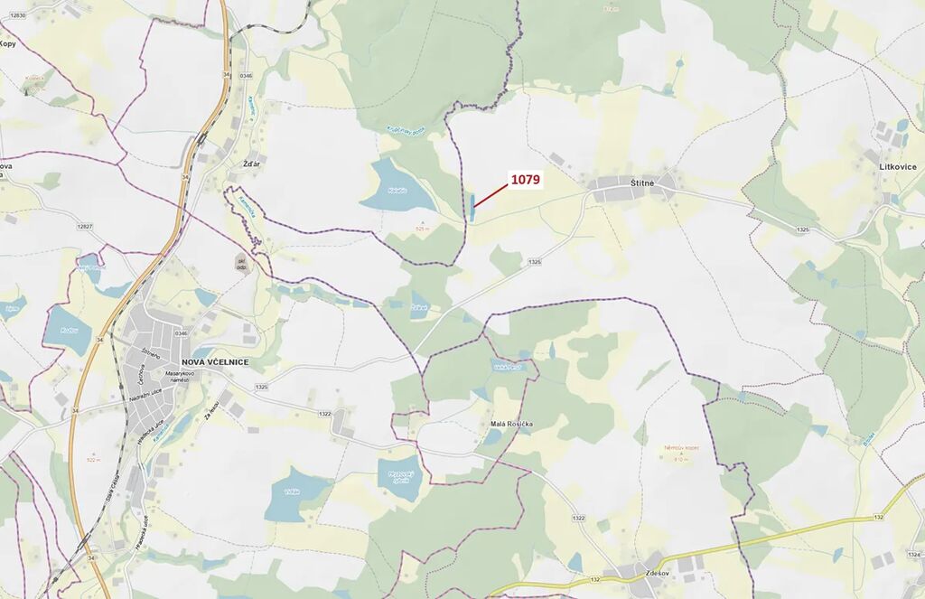 Lesní pozemek o výměře 5041 m2, parcelní číslo 1079, podíl 1/1, katastrální území Štítné, obec Žirovnice, obec s rozšířenou působností Pelhřimov, okres Pelhřimov, Kraj Vysočina. Částečně po těžbě.
