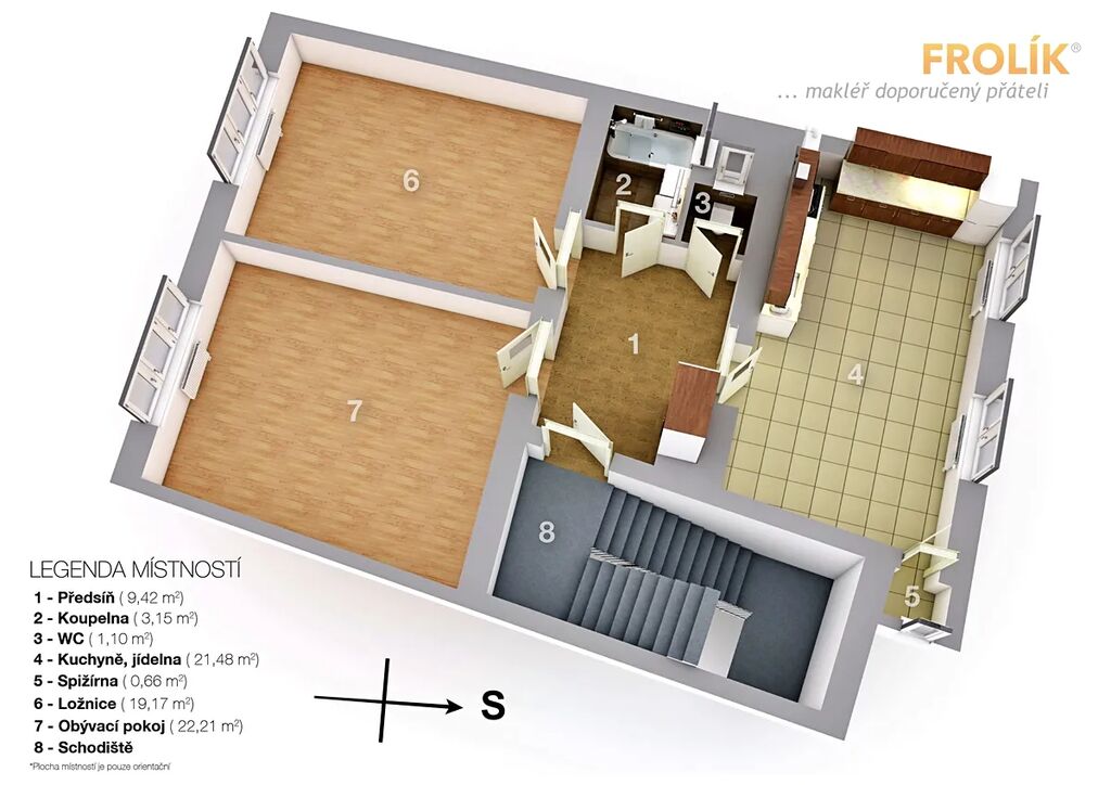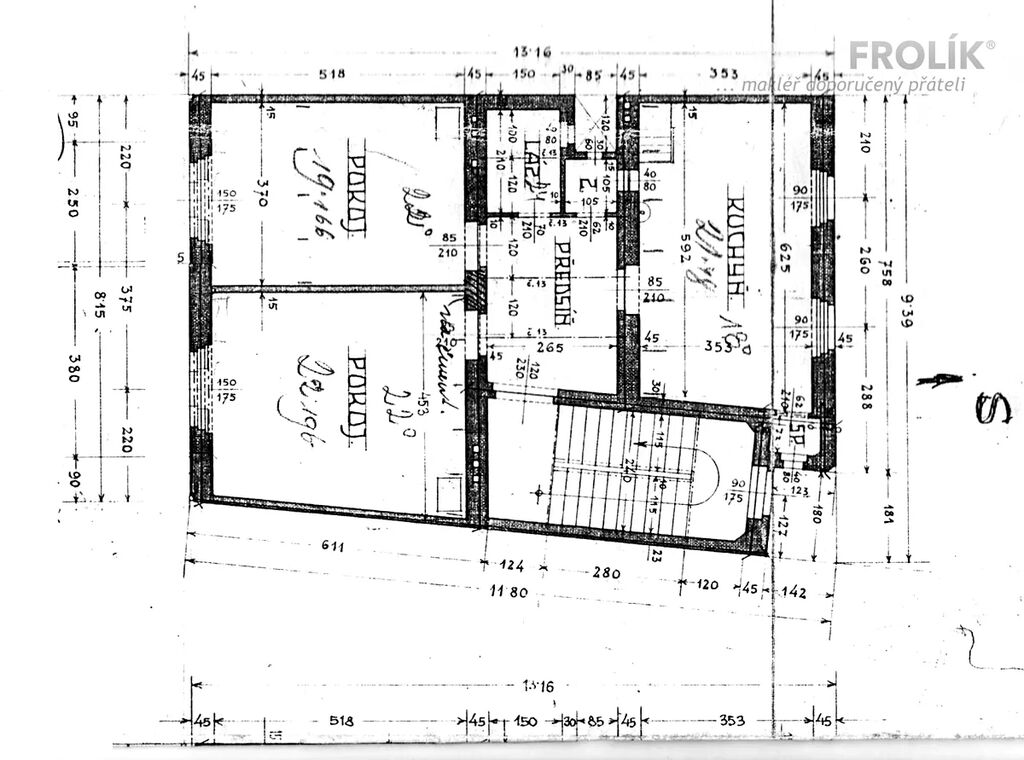 Byt o výměře cca 77 m2 byl původně navržený jako 2+1, ale při troše šikovnosti se dá užívat i jako skromnější 3+kk. Má totiž velké místnosti a tak se z poloviny kuchyně (která má cca 22 m2) dá udělat i malý obýváček.