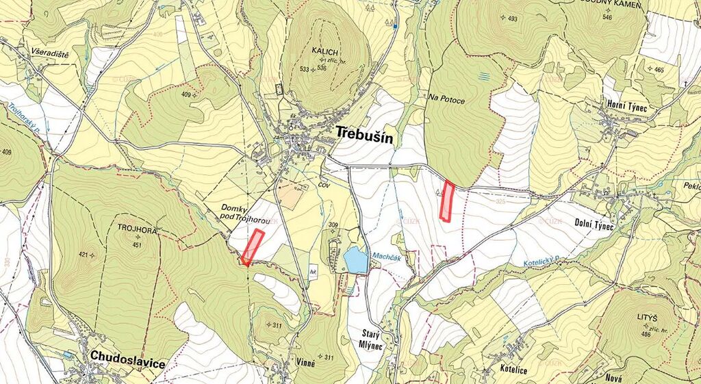 V katastrálním území Třebušín, okres Litoměřice, nabízíme k prodeji dva pozemky ve výlučném vlastnictví o celkové výměře 32 021 m². Pozemky jsou zapsány na listu vlastnictví č. 902 a tvoří je parcely č. 619/1 a 777/5.