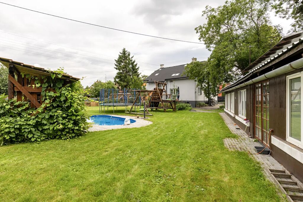 Součástí nemovitosti je terasa (4 × 3 m), bazén (7 × 3,5 m), finská sauna, domácí fitness, pergola a nově vybudované parkovací plochy pro 10 vozů (4 před domem, 6–8 uvnitř pozemku). Celý areál je oplocen novým betonovým plotem (cca 130 m) se dvěma vjezdy – 6m brána na dálkové ovládání a 5m manuální brána.