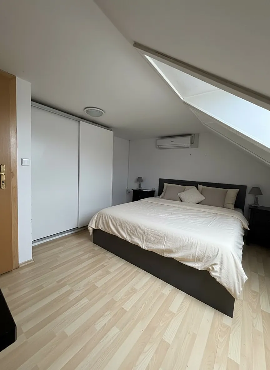 Dispozice bytu je 3+kk. Chodba, kuchyňský kout spojen s obývacím pokojem, dětský pokoj, v mezipatře ložnice s klimatizací, samostatné WC, koupelna s vanou.