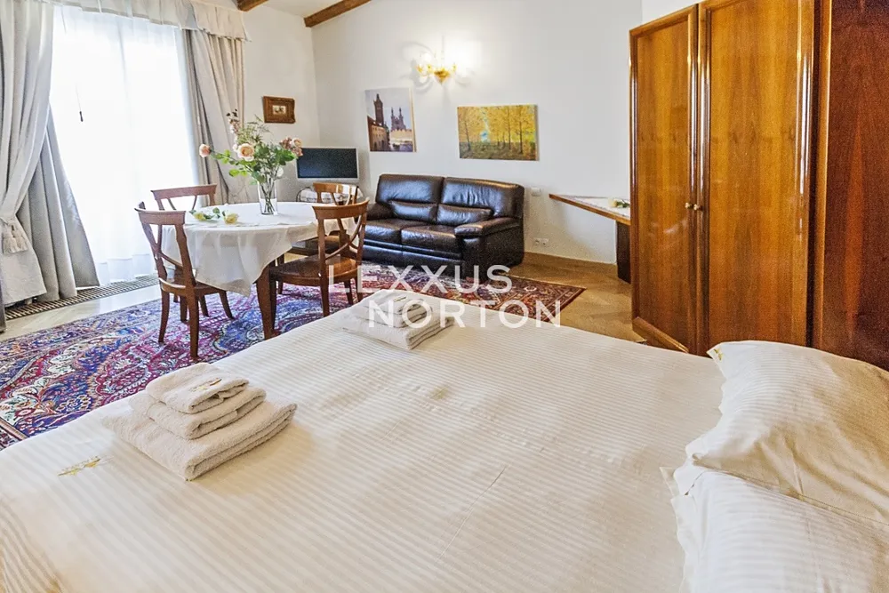 V 5. nadzemním podlaží bytového projektu je situován tento reprezentativní, zařízený byt 1+kk k pronájmu, disponující velkorysou obytnou plochou celých 38 m2. Útulný interiér se sestává ze vstupní chodby a reprezentativního, prakticky řešeného obývacího pokoje s ložnicovou zónou, jídelním koutem a moderně vybaveným kuchyňským koutem a 1 koupelnou. Z obývacího pokoje je uzpůsoben vstup na balkon. Možnost pronájmu garážové stání za příplatek 5000 CZK + DPH a užívání společné zahrady a bazénu.