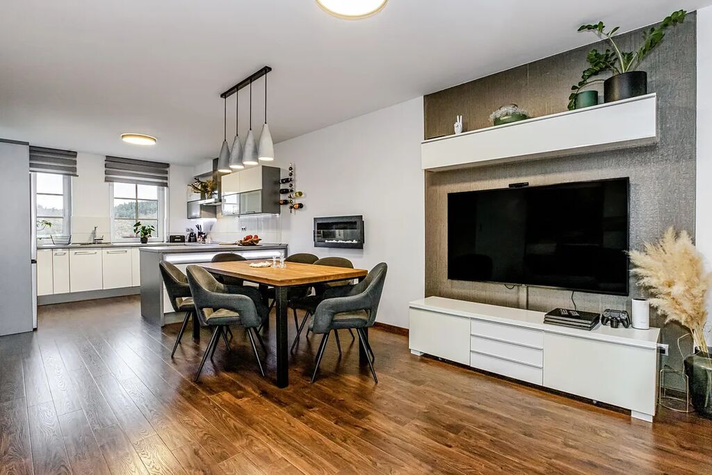 Prostorný obývací pokoj propojený s plně vybavenou kuchyní