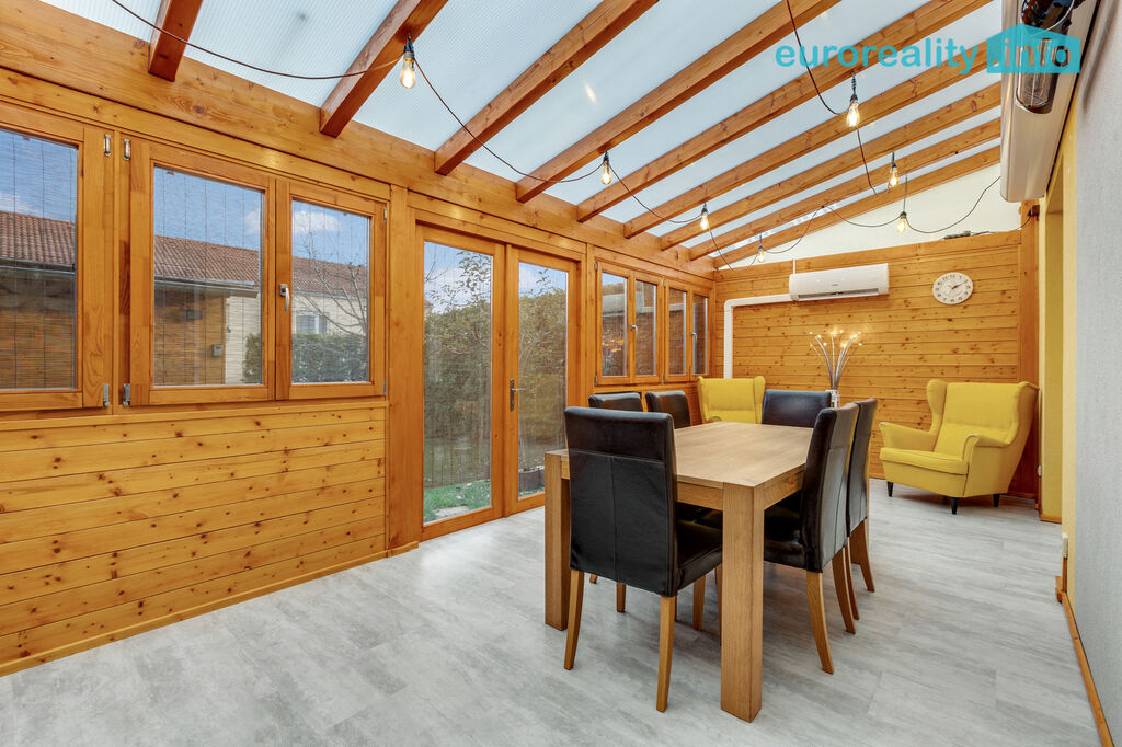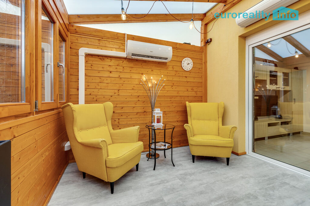Přízemí: obývací pokoj s jídelnou (32 m²) a kuchyňským koutem (5 m²), kde se vaří i ty nejlepší nedělní řízky. K tomu koupelna se sprchovým koutem, technická místnost, zádveří a jako bonus zimní zahrada (21 m²) – celoročně obyvatelná, s klimatizací, ideální na grilovací afterparty nebo zimní čtení s čajem, nebo každodenní posezení s rodinou.