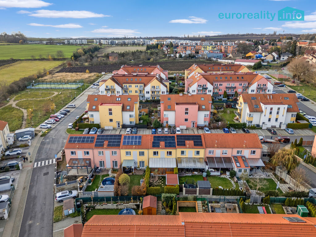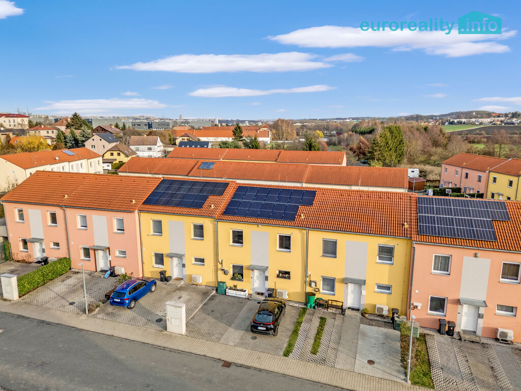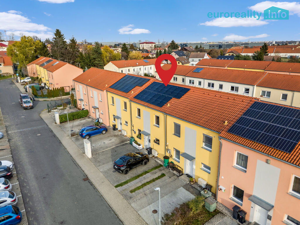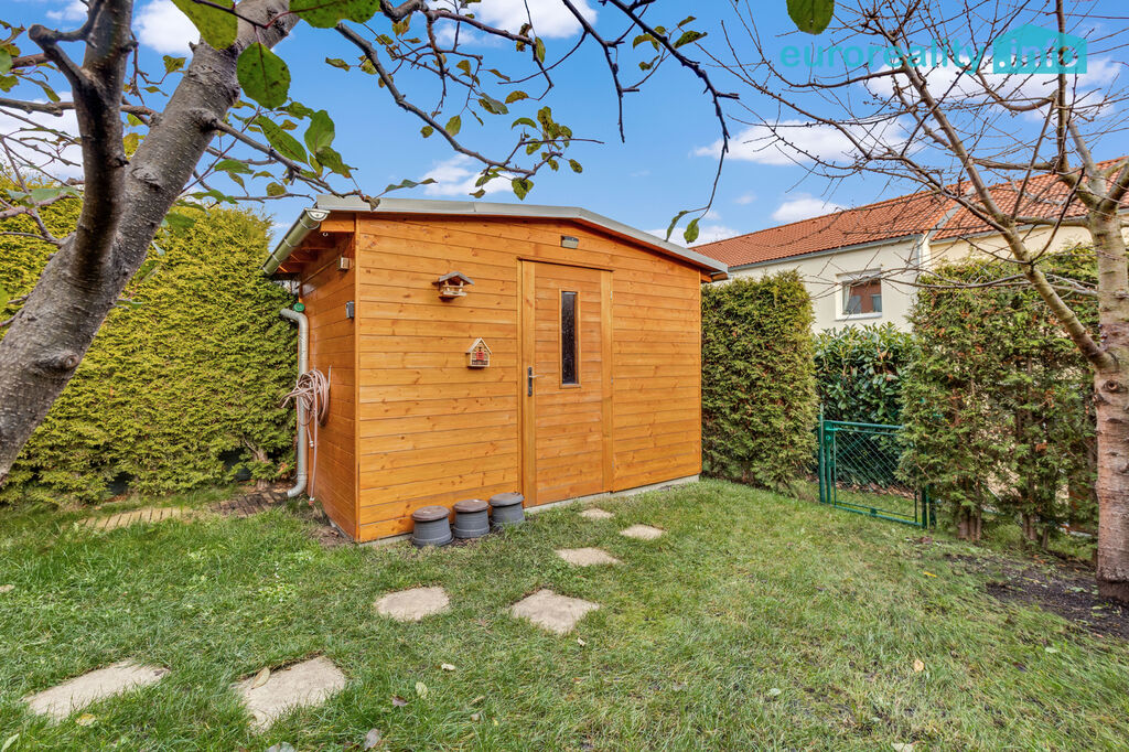 Exteriér: vlastní pozemek 52 m2 před domem, dvě parkovací stání pro větší auta, místo pro tři motocykly a stojan na kola. A ještě zahradní domek (8,75 m²), který zvládne být úložným prostorem i malou dílnou.