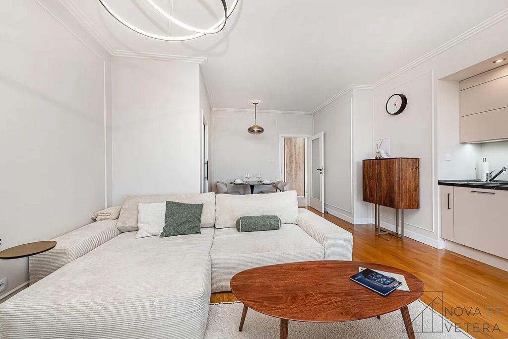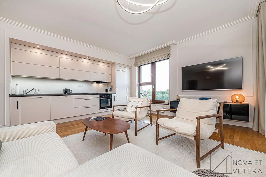 Dispozice bytu zahrnuje prostorný obývací pokoj s kuchyňskou linkou na míru s moderními spotřebiči a přímým vstupem na terasu o velikosti 11 m², dvě samostatné ložnice, dvě toalety, koupelnu po kompletní rekonstrukci z roku 2024 se sprchovým koutem a praktickou vstupní chodbu s dostatkem úložného prostoru. K bytu náleží také sklep o velikosti 2,85 m² a garážové stání. Je možné převzít nájem druhého garážového stání.