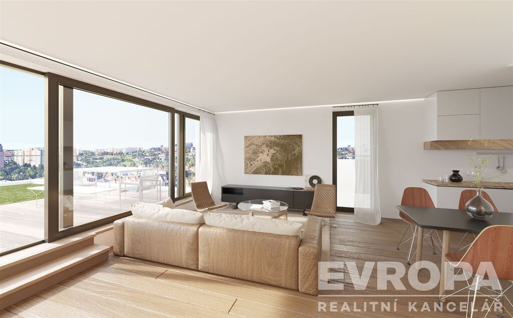 Celková užitná plocha 103,4 m² je doplněna o tři terasy o celkové rozloze 57,6 m² a privátní střešní zahradu s výhledem o 64,7 m². Vzniká tak prostor, který otevírá nové možnosti bydlení – od ranních snídaní na slunci, přes intimní večerní posezení s výhledy na vilovou čtvrť, až po možnost vytvořit si vlastní wellness či lounge zónu.
