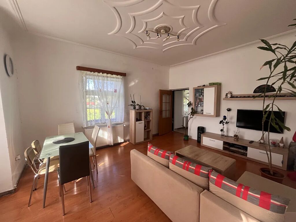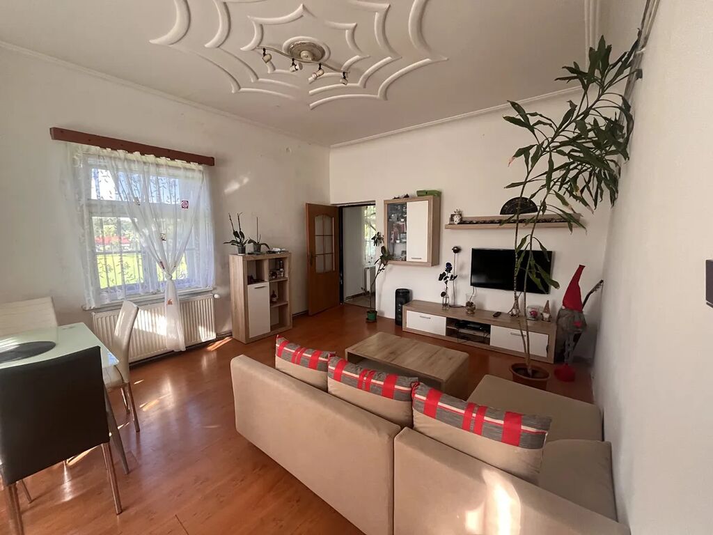 Byt je po částečné rekonstrukci kuchyně a podlah. Z kraje roku 2026 bude v bytě montovaná nová kuchyňská linka. Je ve 3.NP a jeho výměra je 134m2. V bytě jsou původní dřevěná okna, je zde etážové topení na tuhá paliva. Kotel na tuhá paliva. V létě roku 2026 budou majitele instalovaná nová plastová okna. Voda se ohřívá elektrickým bojlerem. Po vstupu do předsíně je vstup do koupelny kuchyně. V koupelně je WC, vana, místo na pračku, umyvadlo a je zde i velké okno. V kuchyni je kuchyňská linka, se sporákem, nerezovým dřezem. V kuchyni, předsíni a koupelně je dlažba. Z kuchyně se jde do prostorného obývacího pokoje , který je díky oknům světlý a slunný. Na stropě je krásná štuková výzdoba. Za obývacím pokoji jsou další 2 pokoje a jeden je i s proskleným výklenkem.