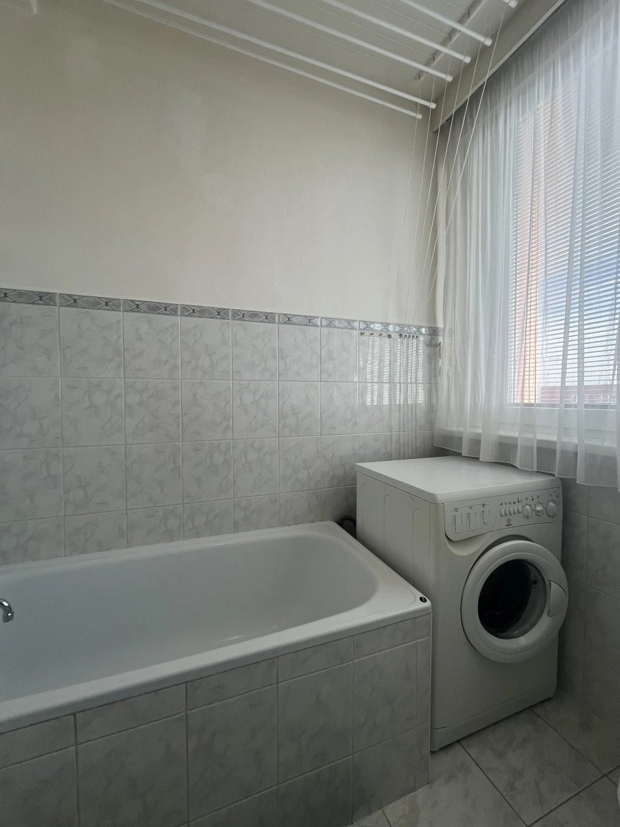 Koupelna: vana, umyvadlo, pračka se sušičkou.