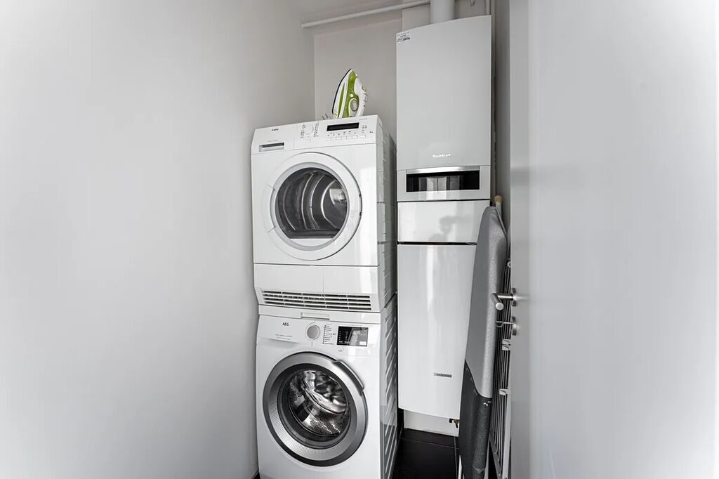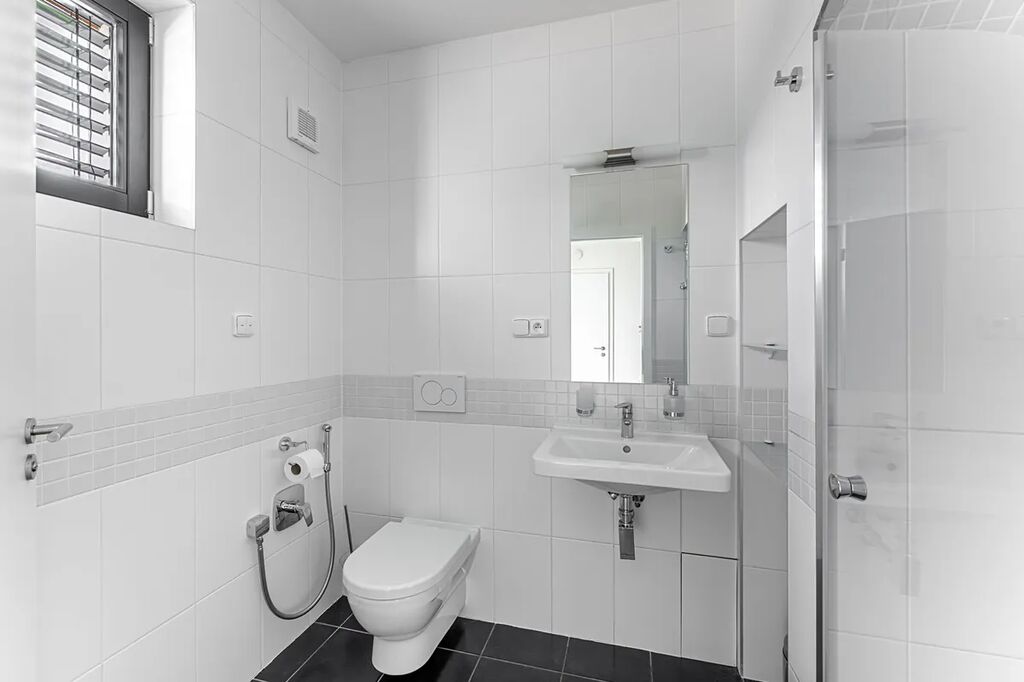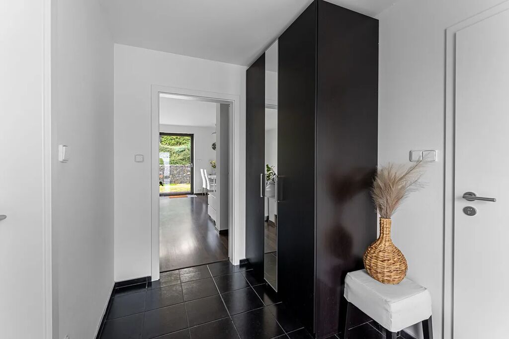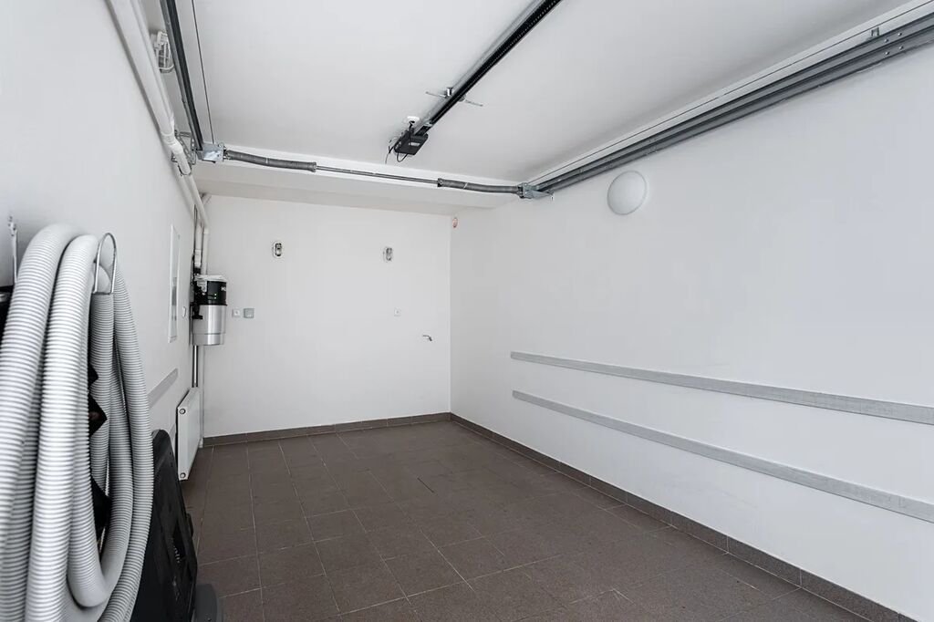 Kuchyně v elegantní bílé barvě je vybavena moderními vestavěnými spotřebiči, včetně lednice, mrazáku, varné desky, digestoře, elektrické trouby, mikrovlnné trouby a myčky. Dům je dále vybaven centrálním vysavačem a venkovními žaluziemi s elektrickým pohonem, které zajišťují maximální komfort a úsporu energie. Podlahy jsou laminátové ve všech pokojích, zatímco v kuchyni, koupelnách a na chodbě najdete černou dlažbu.