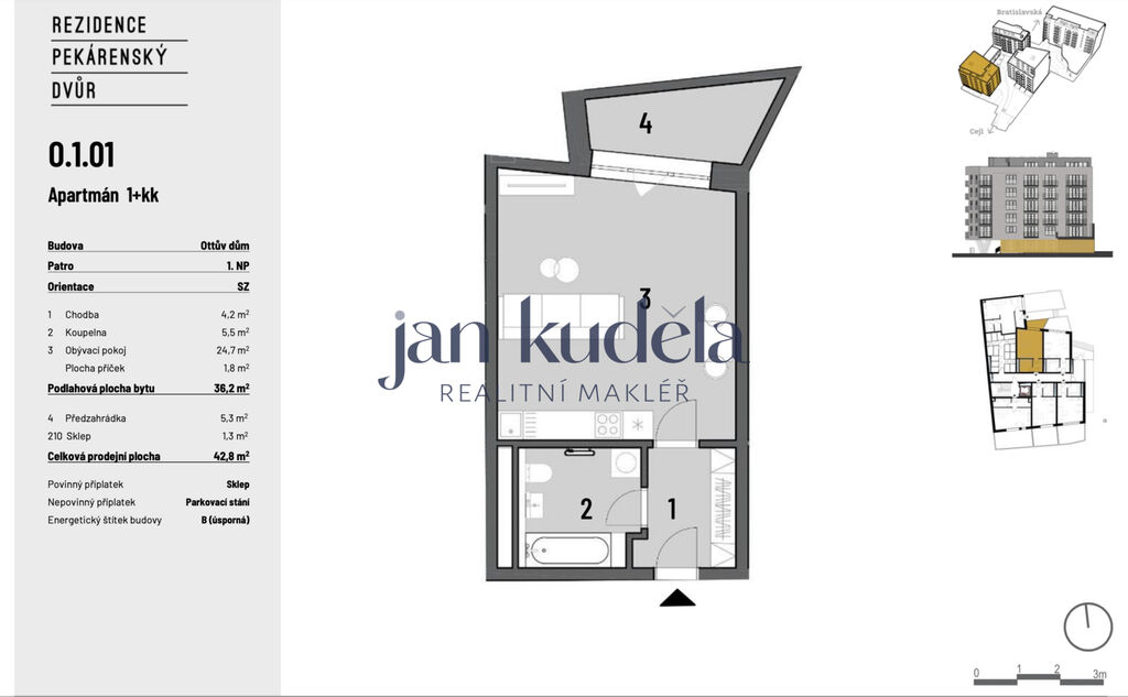 Nabízíme k pronájmu moderní byt o velikosti 1+kk (36,2 m²) s vlastní předzahrádkou a sklepní kójí, který se nachází ve vyhledávaném rezidenčním projektu Pekárenský dvůr na ulici Bratislavská. Byt je situován do klidného vnitrobloku a poskytuje soukromí i pohodlí v rámci nově vzniklé uzavřené rezidenční čtvrti.