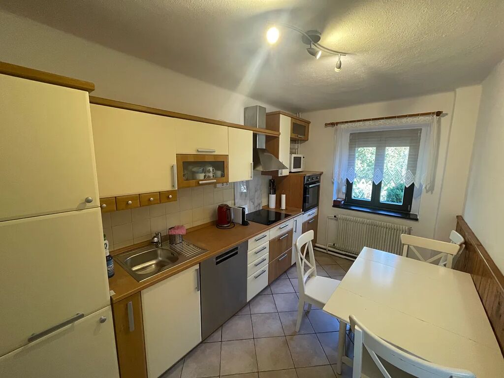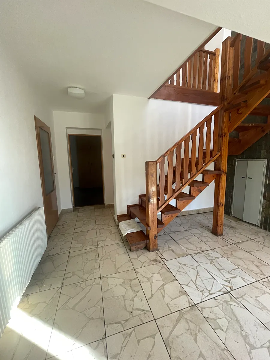 Samotný dům má podlahovou plochu 865 m² a je kompletně podsklepený. V přízemí vás přivítá kuchyně se všemi spotřebiči – velká americká lednice, myčka, sklokeramická deska, elektrická trouba, mikrovlnná trouba – a velkým jídelním stolem. Kuchyně plynule navazuje na útulný obývací prostor s krbem, který vytváří příjemnou atmosféru domova. V 1. nadzemním podlaží jsou tři prostorné ložnice a jedna menší místnost vhodná jako dětský pokoj, šatna nebo pracovna. K dispozici je také koupelna s rohovou vanou, toaletou a vstupem na půdu.