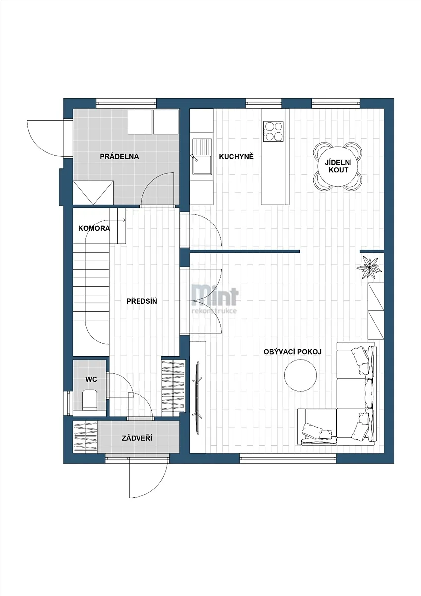 Suterén zahrnuje chodbu, garáž, sklad, technickou místnost a prádelnu, což poskytuje dostatek úložného prostoru.