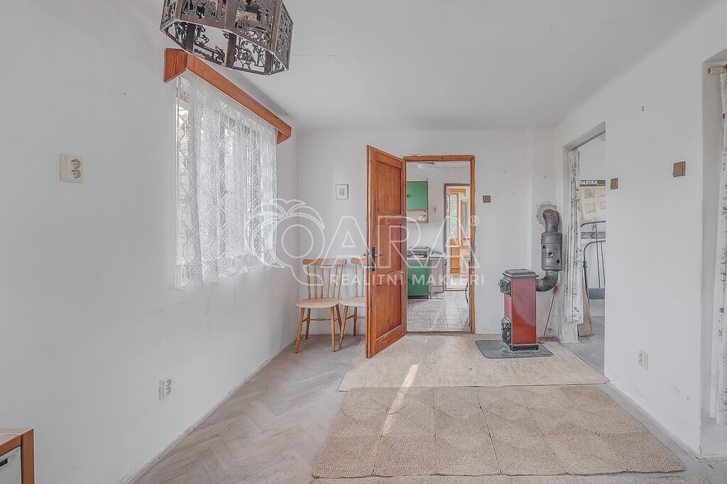 Dispozice: 1. NP - vstupní prosklená veranda, chodba se vstupem do obytného podkroví, kuchyň s kamny na TP, pokoj a dvě menší ložnice, WC a sprchový kout.
