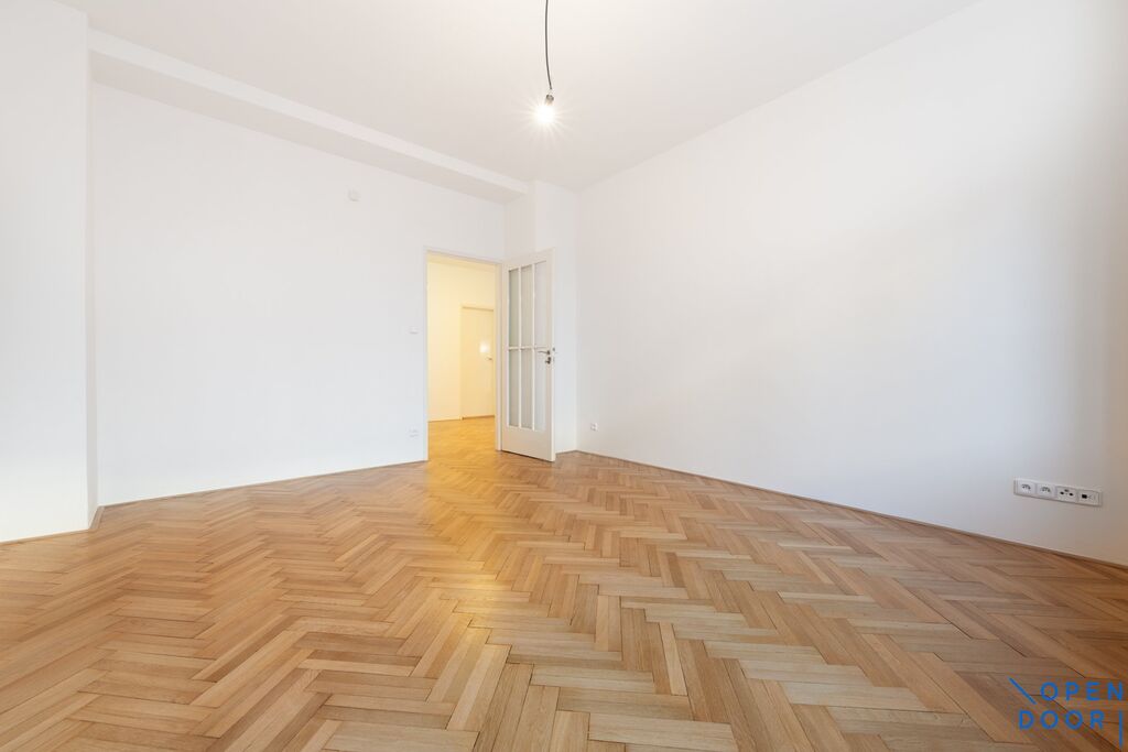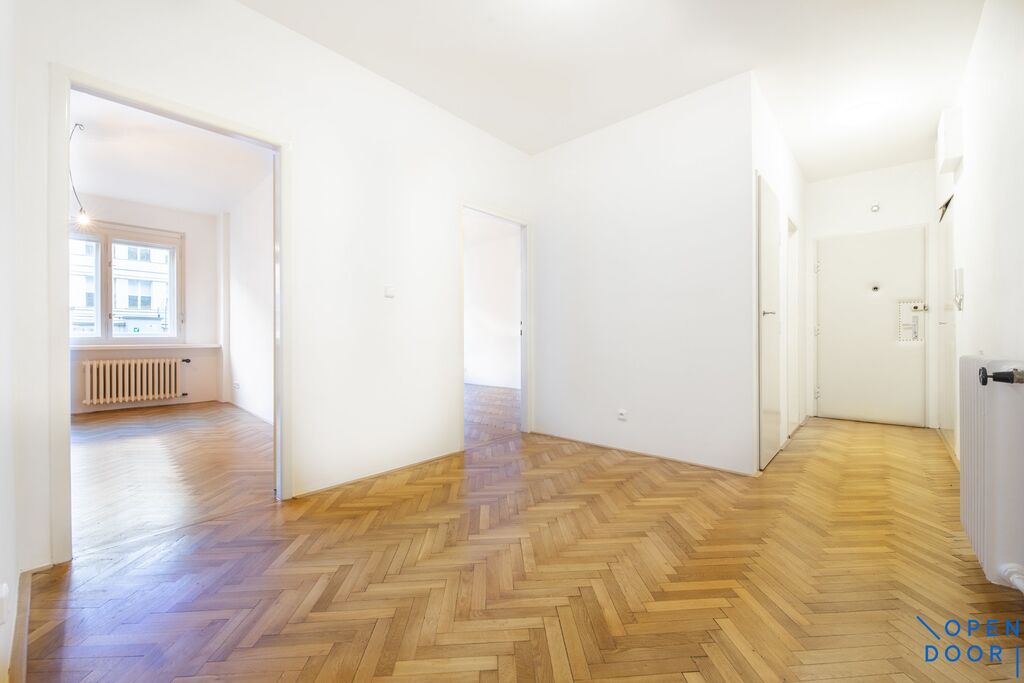 Všechny místnosti bytu jsou přístupné z prostorné vstupní haly. Byt má tři neprůchozí pokoje, dva směřují do ulice, třetí má okno do tichého vnitrobloku, novou kuchyň vybavenou kuchyňskou linkou. Koupelna je s vanou, WC samostatně, praktickou součástí bytu jsou dvě komory a původní vestavěné úložné prostory v hale.