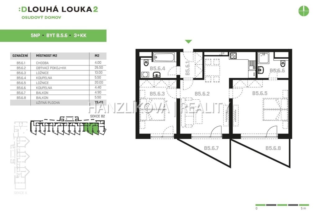 Nabízíme k pronájmu nadstandardní bytovou jednotku 3+kk o výměře 73,60 m2 + balkony 10,40 m2, který se nachází ve 5.NP nového rezidenčního komplexu DLOUHÁ LOUKA 2.etapa. Byt se skládá z: předsíně, dvou koupelen, dvou samostatných pokojů a prostorného obývacího pokoje s kuchyní. Byt je orientovaný na jiho-východ. Z obývacího pokoje a ložnice je přístup na samostatný balkon (celkem 5,52 + 4,50 m2) . Byt je vybaven kuchyňskou linkou se spotřebiči (lednice, myčka, sporák, varná deska, digestoř), osvětlením ve všech místnostech a vybavením koupelny (sprchový kout i vana). Fotografie jsou ilustrační. Dům je vybaven výtahem, kabel. rozvody, internetem. V přízemí jsou umístěny společné prostory - kolárna, kočárkárna. k bytu náleží jedno garážové parovací stání za úplatu 1.200,-Kč/měs. Ideální poloha v centru krajského města a přesto uprostřed zeleně vytváří z bytů na DLOUHÉ LOUCE osudový domov. Pronájem nekuřákům bez domácích mazlíčků. Byt bude volný od 1.1.2026.