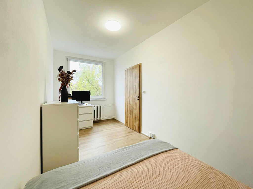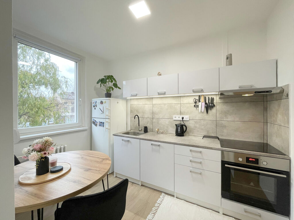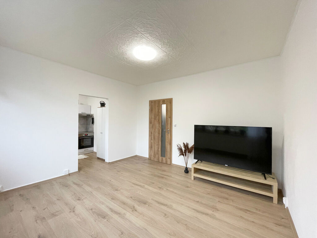 Byt byl zrekonstruován „od podlahy“ – doslova. Nové omítky, rozvody elektřiny, podlahové krytiny, interiérové dveře i kompletně nová koupelna přinášejí pocit, že vstupujete do zcela nového bydlení. Díky světlým materiálům a čerstvému designu působí byt velmi vzdušně a moderně.