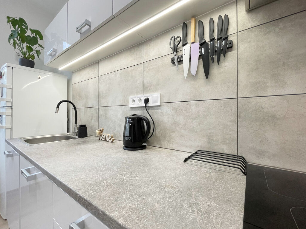 Obývací pokoj zaujme svou prostorností a velkým oknem na západ, díky kterému je místnost téměř celý den krásně prosvětlená. Z této hlavní obytné části vstoupíte do útulné ložnice, kde zůstává dostatek místa nejen na postel, ale i na pracovní stůl. Kuchyně je praktická a moderní – vybavena troubou, varnou deskou, digestoří i lednicí. V lince je také připravené místo a rozvody pro případné doplnění myčky nádobí.