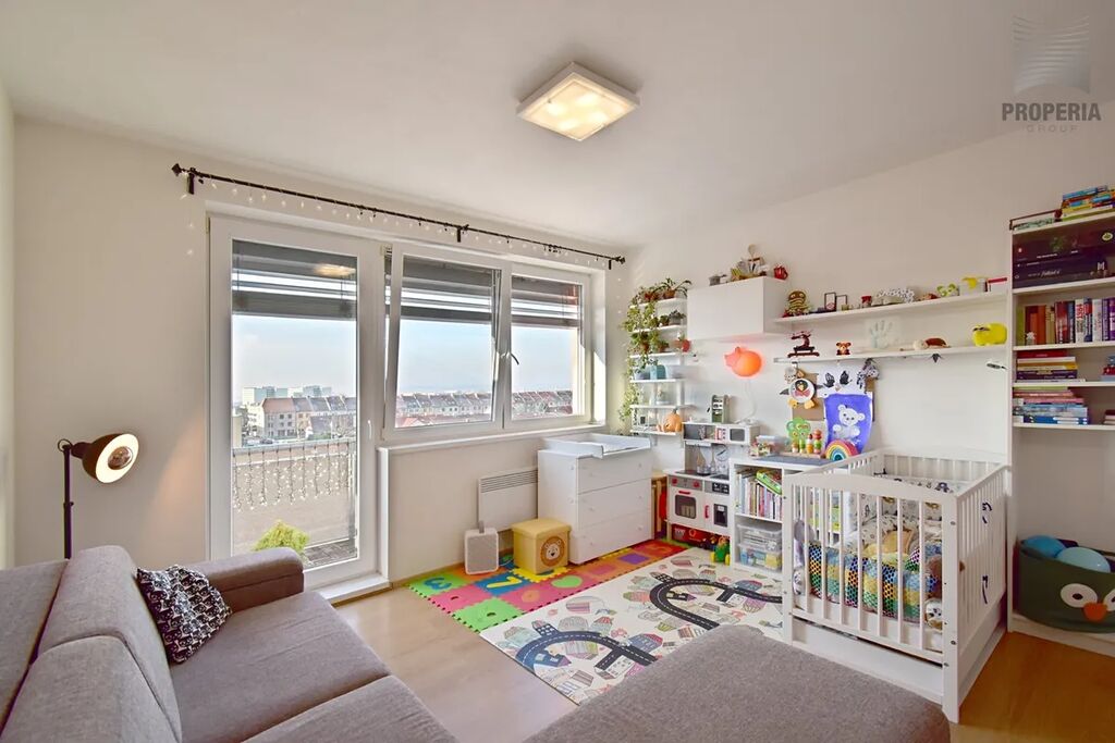 Obývací pokoj je propojen s kuchyňským koutem 23,55 m2 a vstupem na balkón 3,45 m2. Balkón je situovaný na jihozápad a poskytuje krásný výhled na Brno.