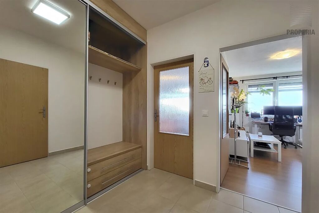 Při vstupu do bytu se ocitnete v prostorné předsíni 6,33m2, ze které se dále dostanete do dvou oddělených pokojů a koupelny s toaletou 3,49 m2.