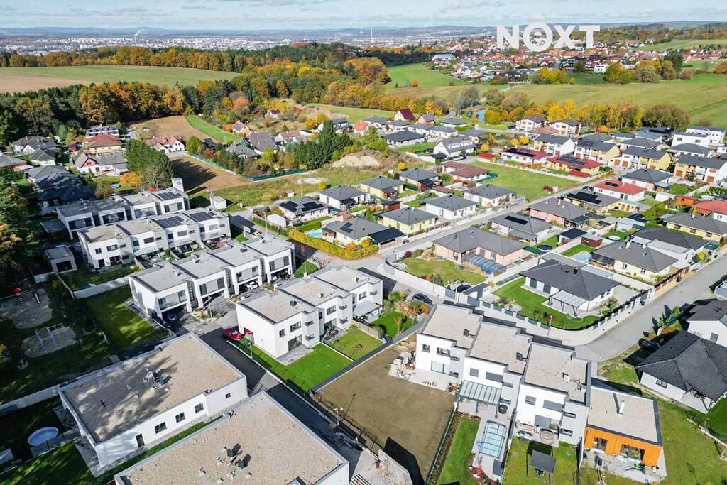 Elegantní prosklené schodiště vede do prvního patra, kde se nachází soukromá část domu. Hlavní ložnice o 16,09 m² působí vzdušně a nabízí klid s příjemným výhledem. Druhý pokoj o 13,95 m² je ideální jako dětský pokoj nebo pracovna. Třetí pokoj o velikosti 12,6 m² může sloužit jako druhý dětský pokoj, hobby místnost nebo pracovna pro dva. Nechybí ani čtvrtá místnost o 9,89 m², vhodná jako šatna, menší pracovna nebo pokoj pro hosty. Koupelna v patře má 7,59 m², je vybavena vanou i sprchovým koutem a díky oknu působí příjemně, svěže a umožňuje přirozené větrání.