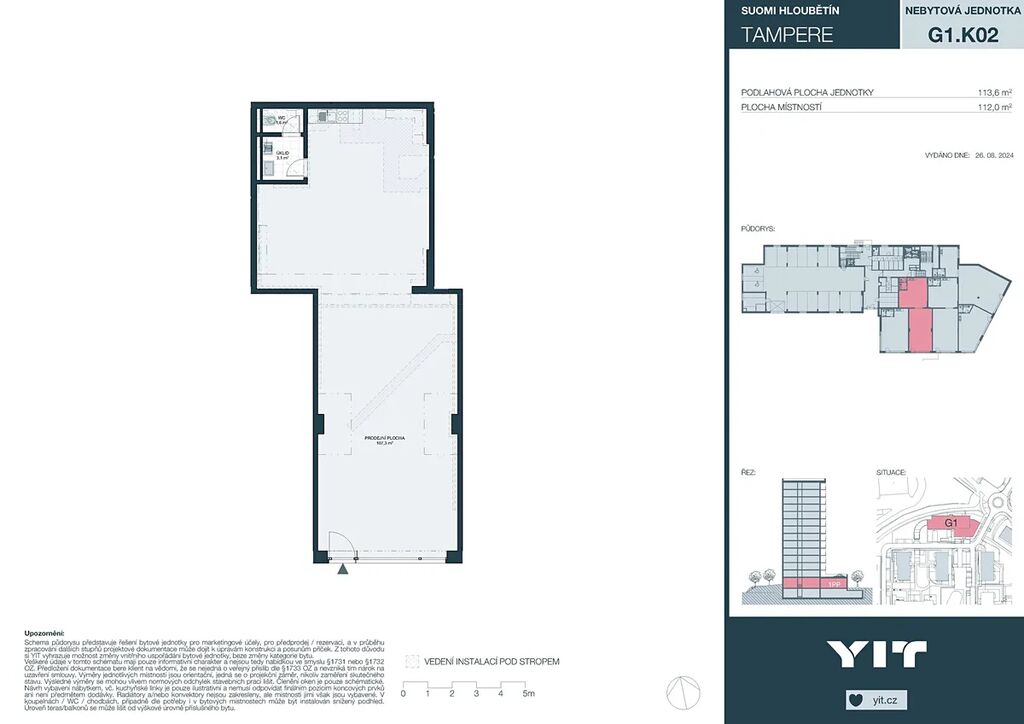 Komerční prostor o celkové rozloze 113,6 m² je situován v 1.PP projektu SUOMI Hloubětín – TAMPERE. (K bytu patří i parkovací stání, které není zahrnuto v ceně.)