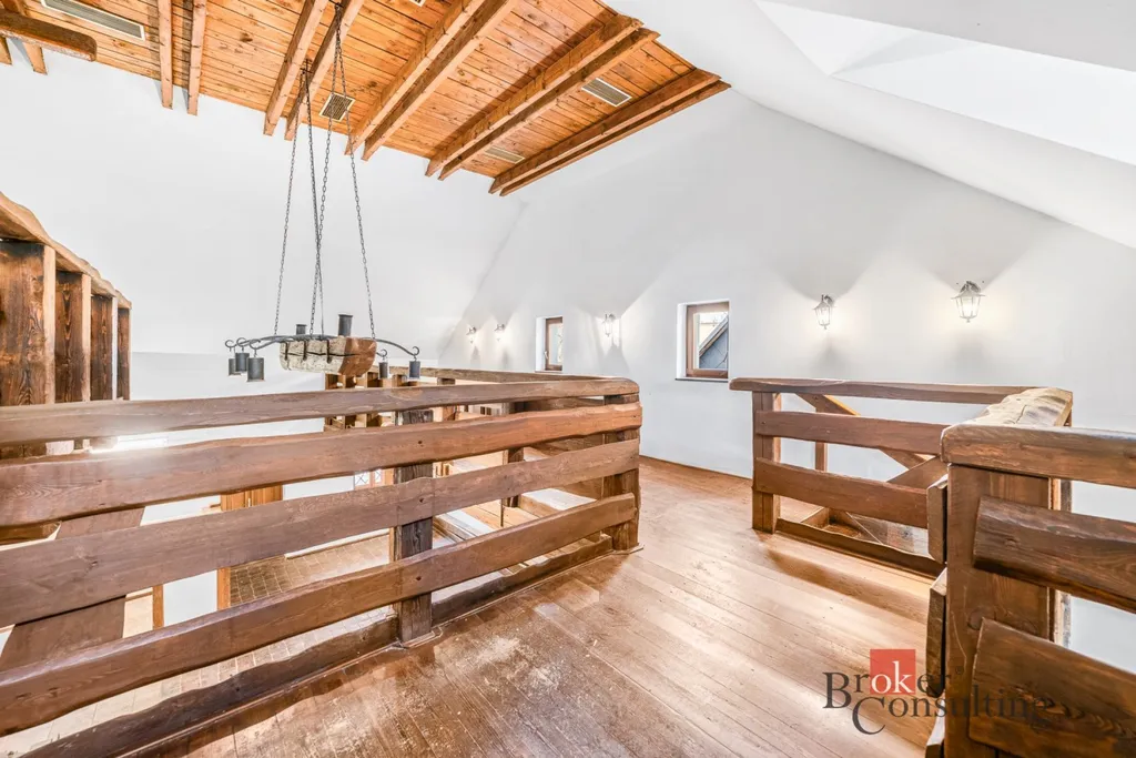 Dominantou celého domu je impozantní centrální místnost s vysokým stropem o velikosti 60,5 m², která přímo vybízí k vytvoření velkorysého obývacího pokoje s kuchyní. Dřevěné schodiště z této části vede do patra, kde se nachází unikátní balkon z masivních trámů, obepínající tři strany místnosti. Tento prostor nabízí dalších 38,7 m² a podtrhuje výjimečnost interiéru.