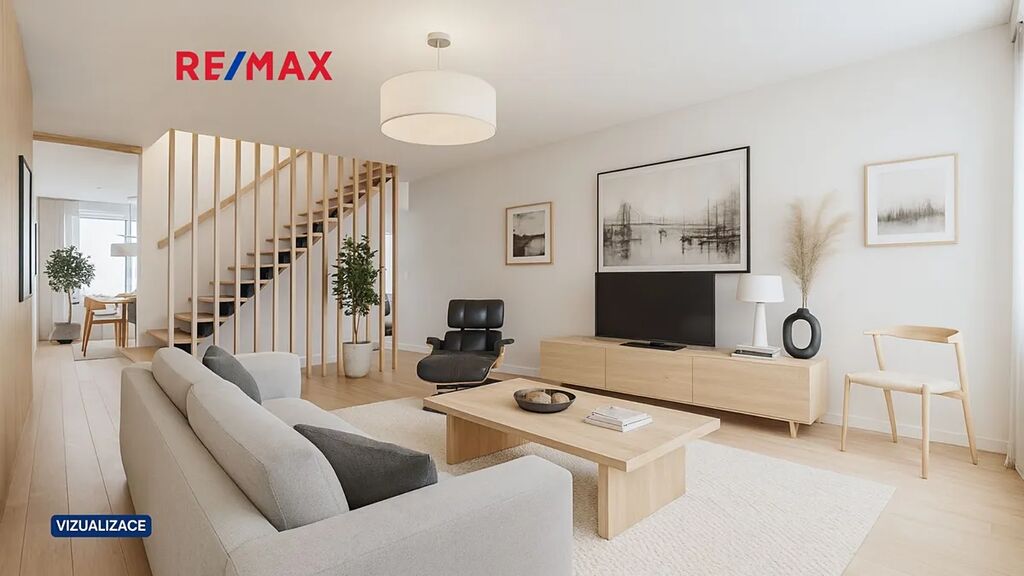 Prostorný obývací pokoj (27,5 m²), samostatná kuchyň (10,5 m²), jídelna (10,1 m²) a schodiště do 2. patra.