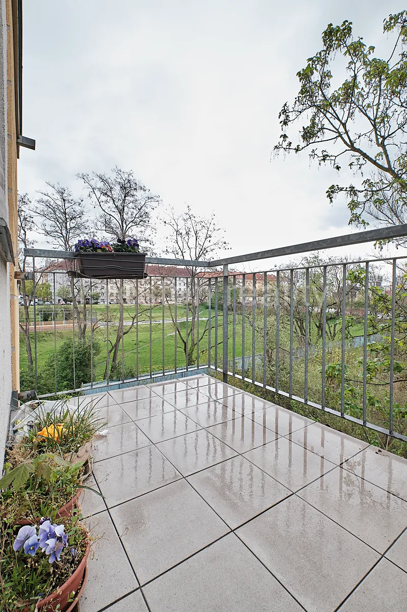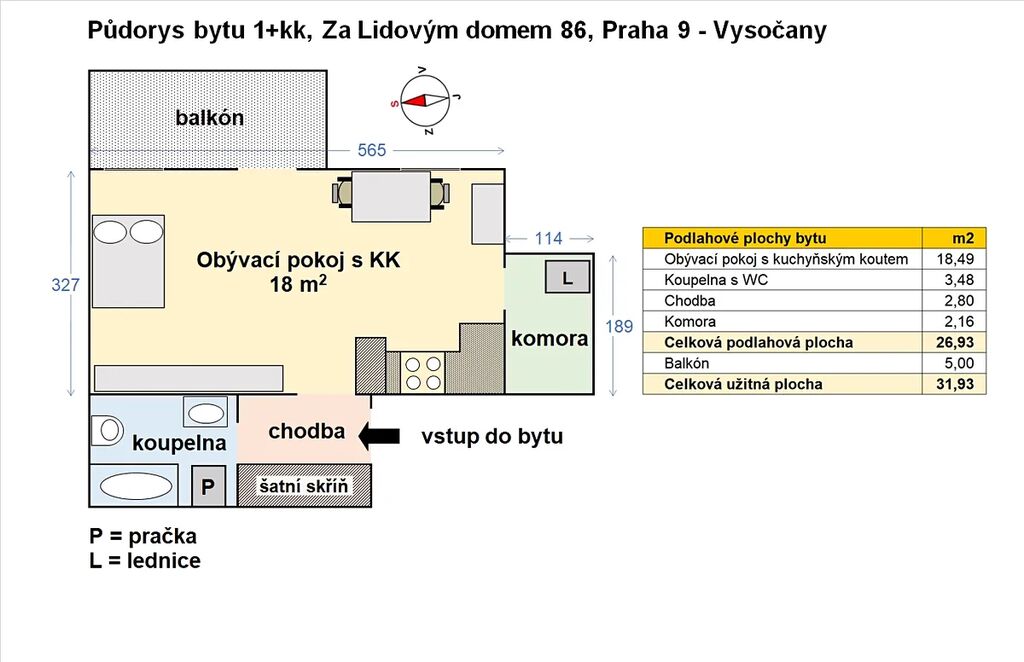 Byt se skládá z jedné místnosti - obývacího pokoje s plně vybavenou kuchyňskou linkou (18 m2). Linka je vybavena sklokeramickou deskou a elektrickou troubou a kompletně nádobím včetně kávovaru. Obývací pokoj je pronajímán s vybavením tak, jak je zobrazeno ve fotodokumentaci, kromě rozkládacího gauče, který byl odvezen (nutno dokoupit postel na spaní). Vedle kuchyňské linky je vstup do praktické komory (2 m2), kde se nachází lednice a policový systém. Z východně orientovaného obývacího pokoje je vstup na velký balkón (5 m2). V koupelně s vanou je rovněž WC a pračka s vrchním plněním (Š 45 cm). V chodbě se nachází za vstupními dveřmi vestavná šatní skříň (Š/H 166/50 cm). K dispozici rovněž vysavač a drobné zařízení bytu (např. věci pro úklid).