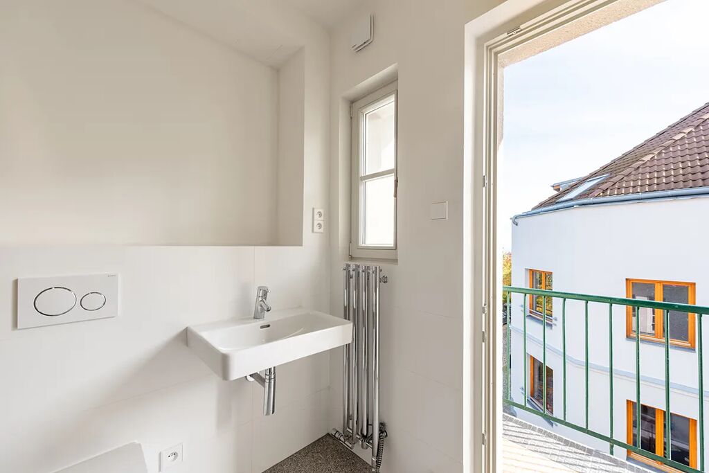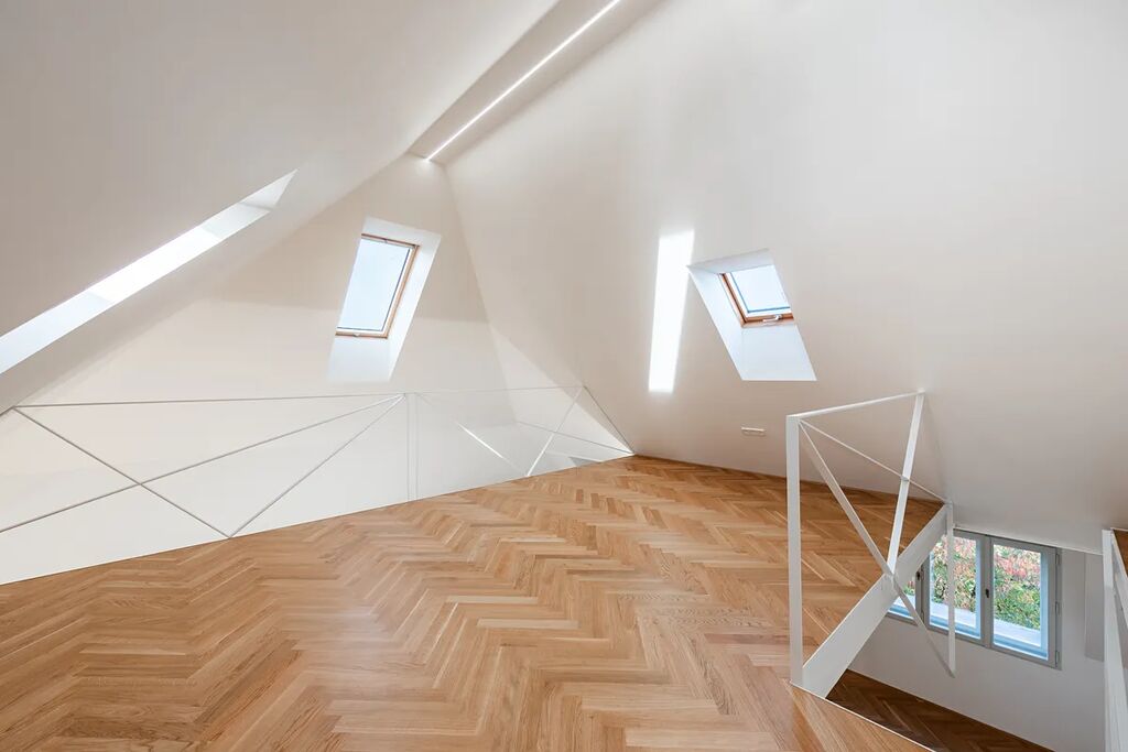 Přestože se byt nachází v podkroví, jeho interiér působí překvapivě civilně a komfortně. Architektonická práce s prostorem potlačuje obvyklé limity podkrovního bydlení – převládají rovné linie, plnohodnotná výška stropů a klasická okenní otvorová konstrukce. Byt je nově dokončen po kolaudaci a připraven k citlivému dotažení v individuálním interiérovém stylu nového majitele.