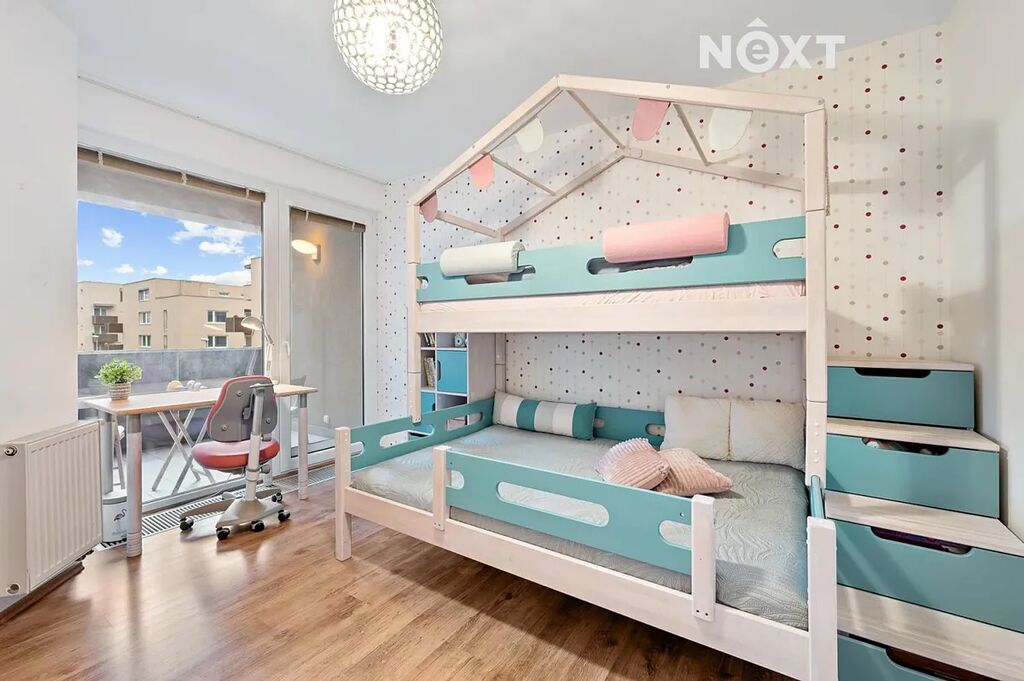 Součástí bytu je také elegantní ložnice s nábytkem na míru a útulný dětský pokoj, který nabízí dost místa pro hraní i odpočinek.
