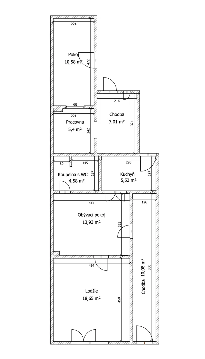 Chodba, obývací pokoj, ze kterého je vstup do koupelny se sprchovým koutem a toaletou, a dále do ložnice. Z chodby je vstup do kuchyně, do pracovny a do dalšího pokoje. Z chodby je také vstup na uzavřený dvorek, který poskytuje absolutní soukromí, a k dispozici je rovněž komora.
