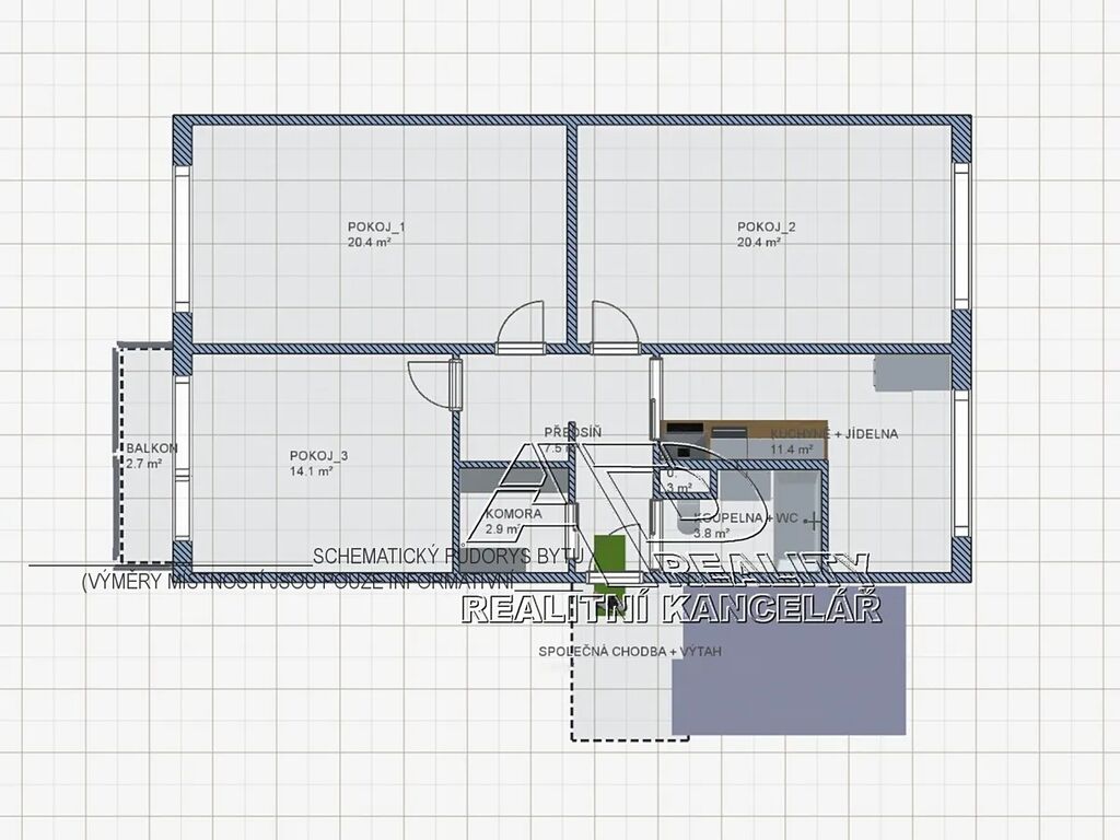 Dispozice bytu: obývací pokoj [20,4m2], pokoj [20,4m2], pokoj [14,3m2] s balkonem [2,8m2], kuchyně [12,2m2], předsíň [6,4m2] s komorou [2,9m2] a koupelna s WC [3,1m2]. K bytu je k dispozici sklepní kóje v 1.NP (technické přízemí) domu o výměře cca [1,5m2]. Topení v bytě centrální / ústřední dálkové, podružné měření spotřeby teplé a studené vody (vodoměry), samostatné měření spotřeby elektřiny (elektroměr), samostatné měření spotřeby zemního plynu (plynoměr). V bytě je možnost připojení internetu a STA.
