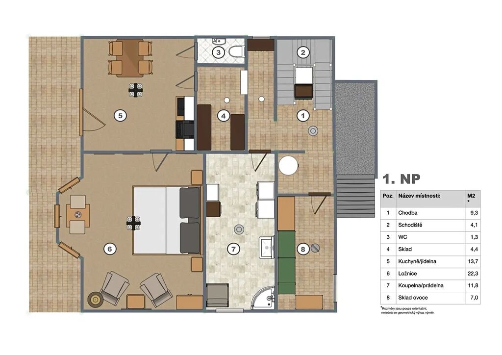 Dům je rozvržen do tří podlaží, přičemž každé z nich nabízí samostatnou obytnou jednotku. Celková užitná plocha domu činí krásných 215 m², zastavěná plocha 317 m².