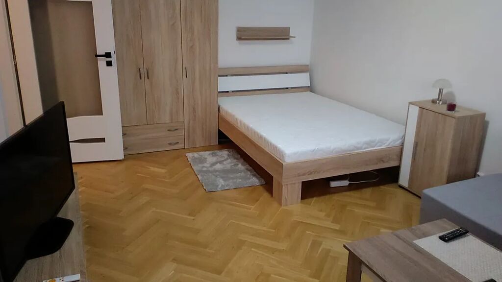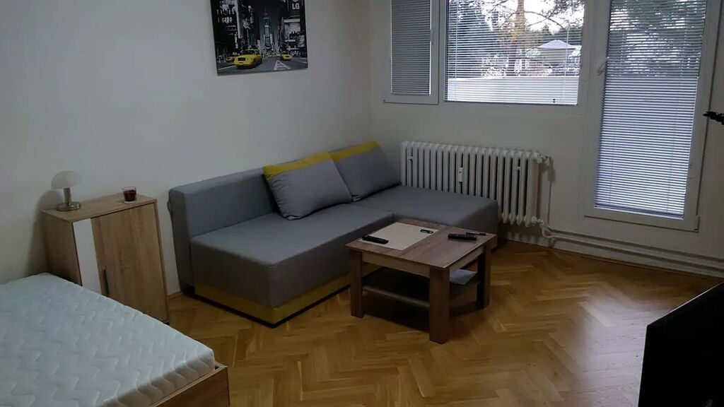 Byt je vybavený - k dispozici je kuchyňská linka s vestavenymi spotrebici, digestoří, troubou a lednicí. V pokoji najdete sedačku, konferenční stůl a manzelskou postel. Prostorná šatna je vybavena policovými regály.