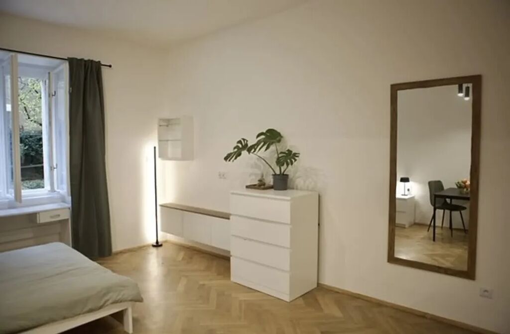 Vybavení bytu zahrnuje základní nábytek přesně tak jak vidíte na fotkách. Také je vybaven spotřebiči jako klimatizace, pračka, sušička, lednice, myčka nádobí, trouba, indukční sporák, mikrovlnná trouba, žehlička, fén. Díky svému praktickému uspořádání a modernímu designu je tento byt ideální pro náročné jedince hledající komfort a klidné bydlení v centru Prahy.