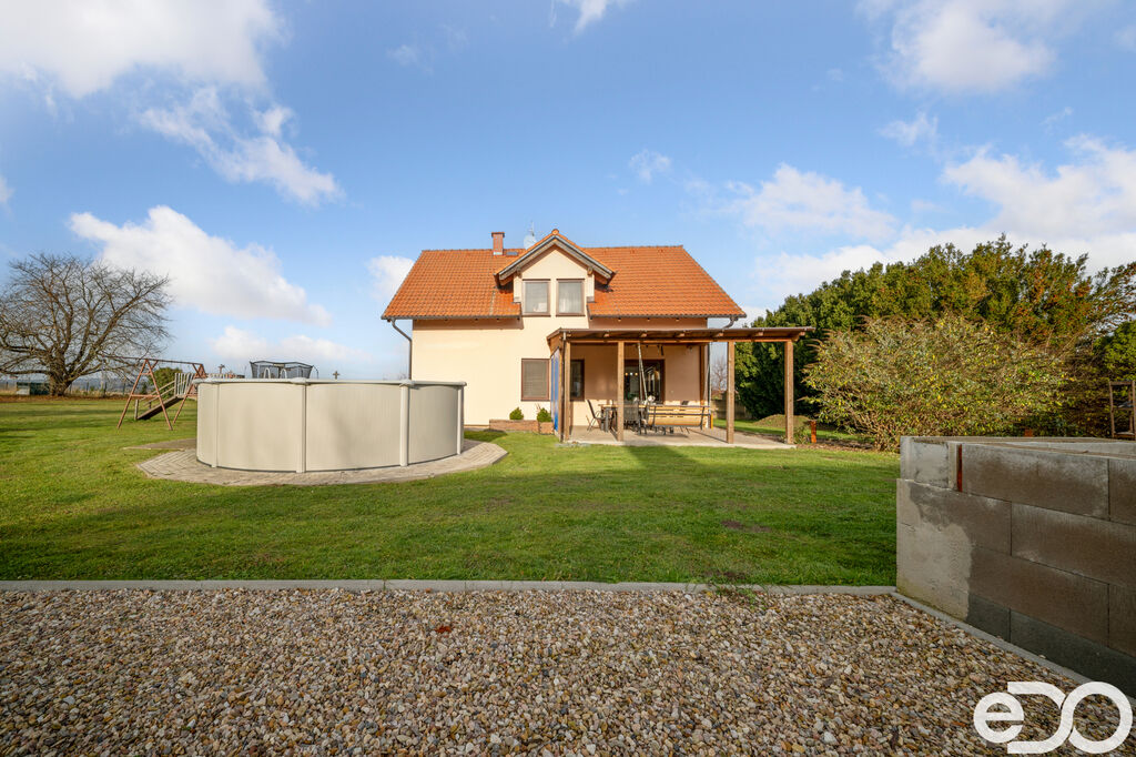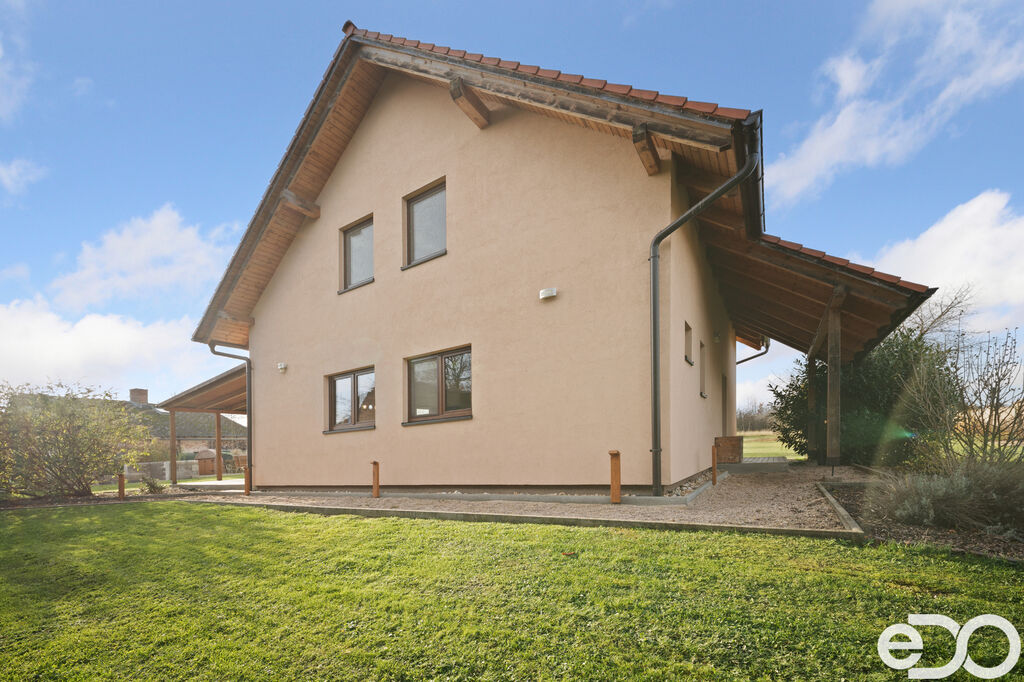 Dominantou pozemku je moderní dřevostavba dokončená v roce 2019. Dispozice je promyšlená do posledního detailu: