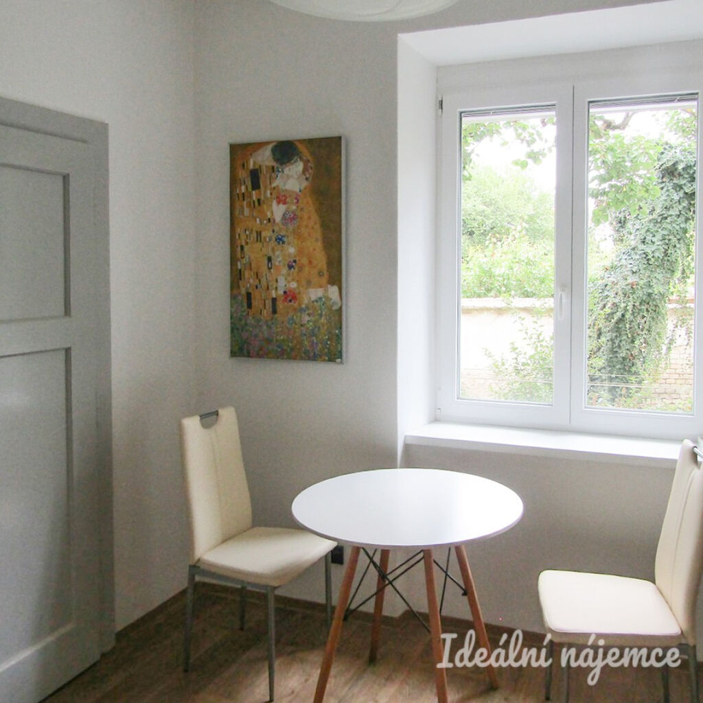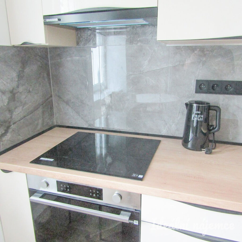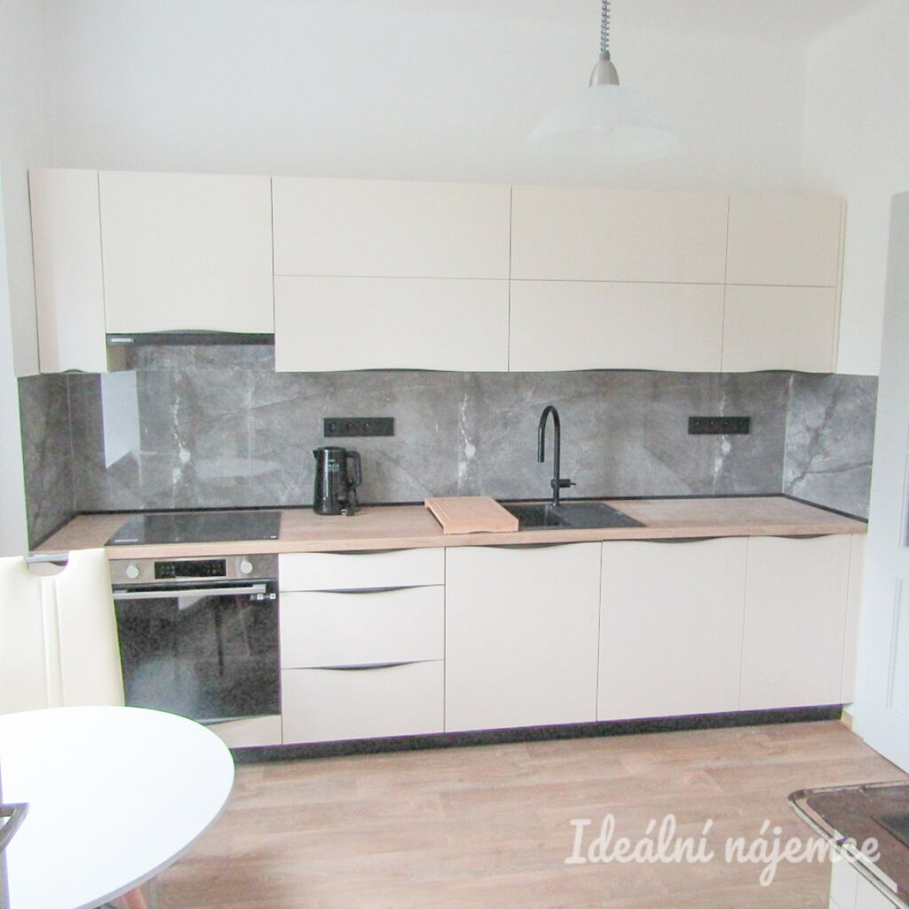 Jedná se o částečně zařízený byt. V kuchyni naleznete kuchyňskou linku s varnou deskou, troubou jídelním stolkem a židlemi.